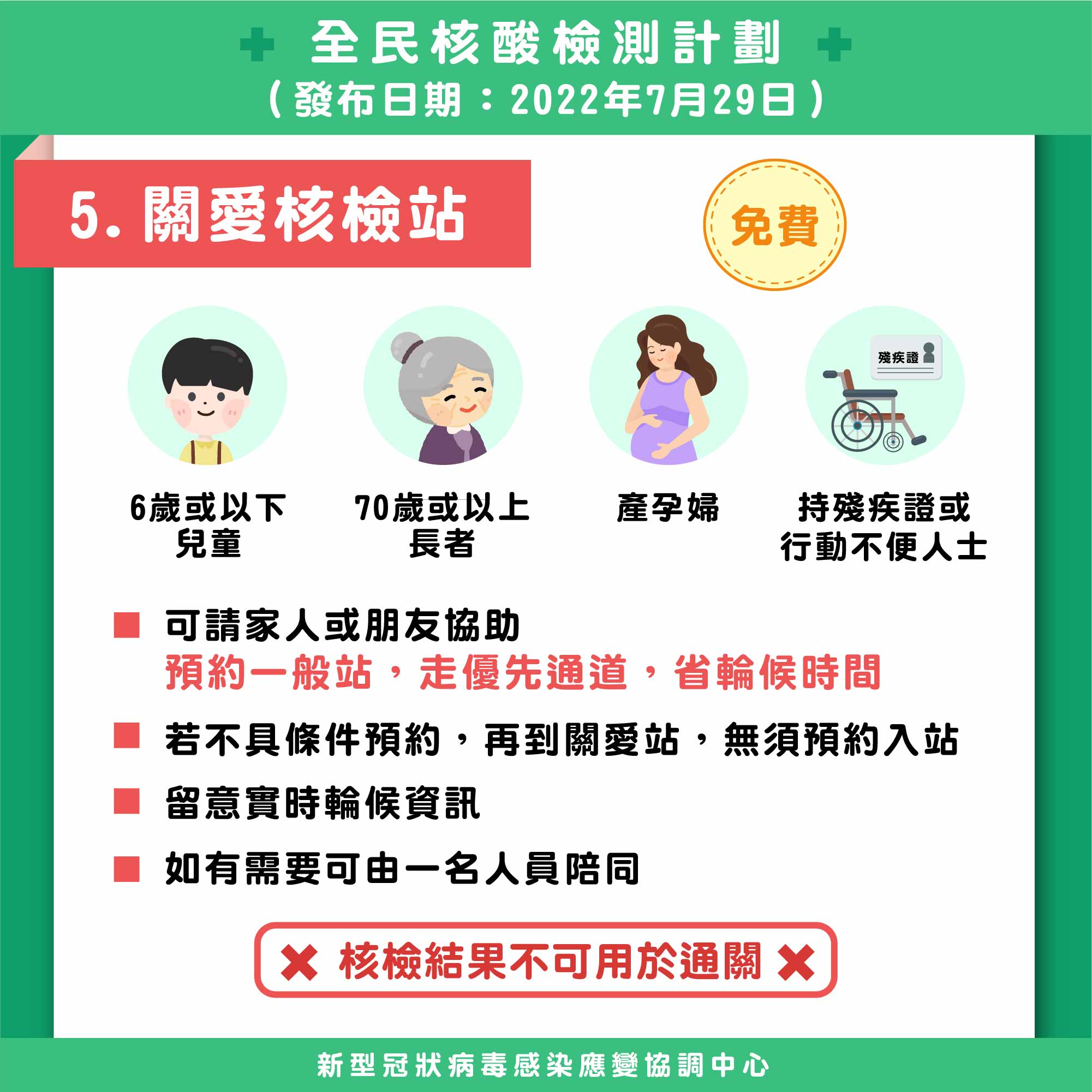 一般站、戶外核檢站均設優先通道,而7個關愛站及優先通道將開放予對象為6歲或以下兒童、70歲或以上長者、產孕婦、持殘疾證或行動不便人士使用,如有需要可由一名人員陪同。