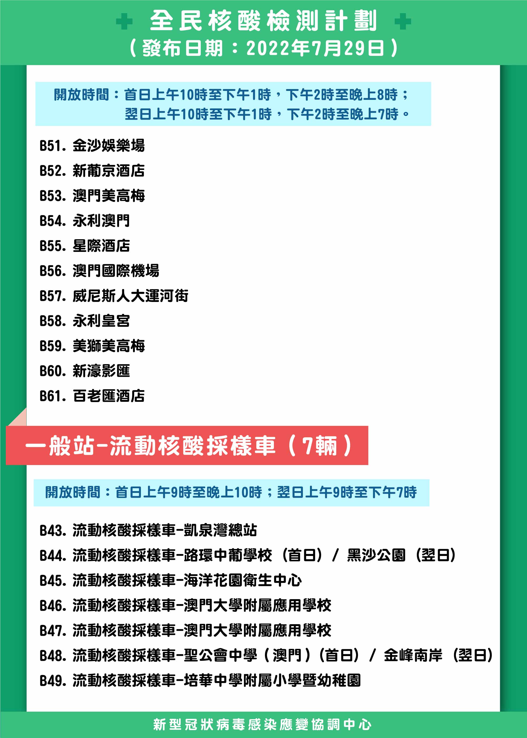 預約系統將於7月30日早上6時開通,可透過以下連結預約進行全民核檢,連結為https://eservice.ssm.gov.mo/allpeoplernatestbook ,檢測結果不可用作通關。