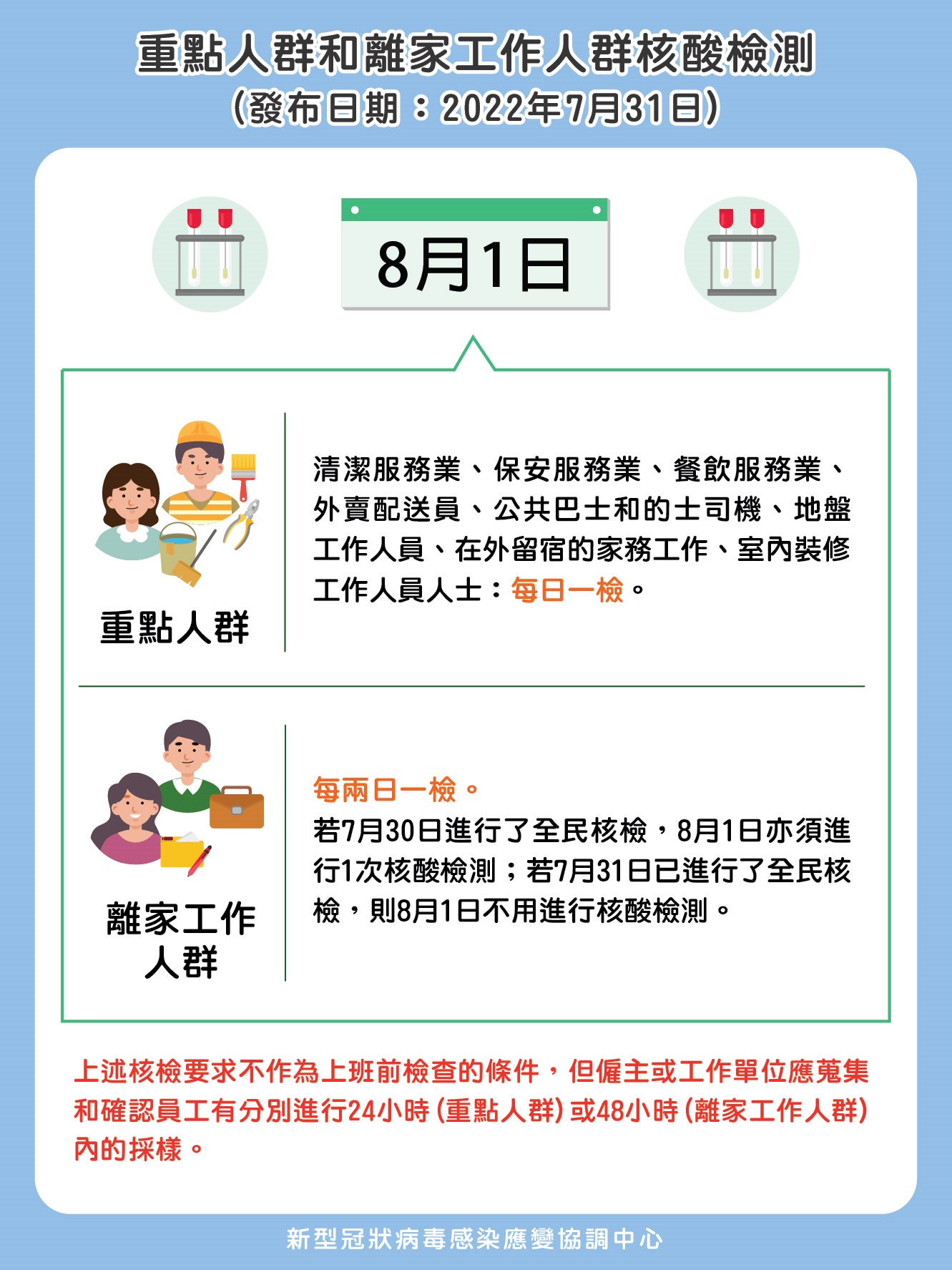 應變協調中心提醒,核檢要求不作為上班前檢查的條件,亦鼓勵僱主酌情允許員工於辦公時間內盡快完成核檢以助分流,但僱主或工作單位應蒐集和確認員工有分別進行24小時(重點人群)或48小時(離家工作人群)內的採樣。