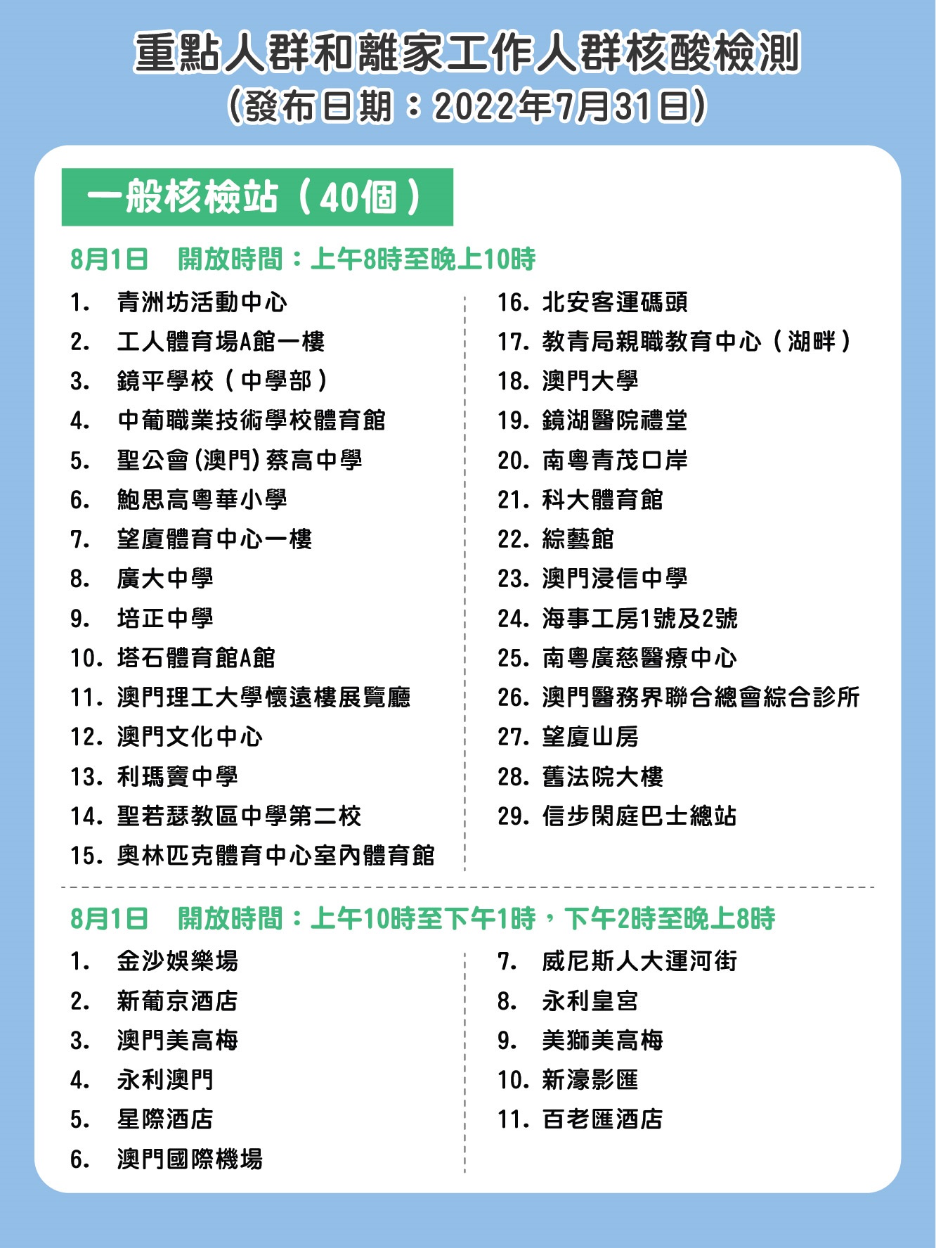 重點人群和離家工作人群核酸檢測站列表 :