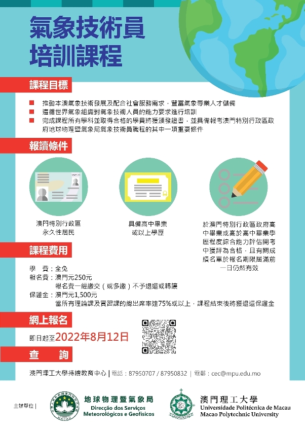 為推動本澳氣象技術發展及配合社會服務需求,豐富氣象專業人才儲備,澳門特別行政區政府地球物理暨氣象局與澳門理工大學合辦“氣象技術員培訓課程”,完成課程所有學科並取得合格的學員將獲頒發證書,並具備報考澳門特別行政區政府氣象局氣象技術員職程的其中一項重要條件。歡迎有意從事氣象專業工作及符合相關報讀條件的澳門永久性居民報讀。