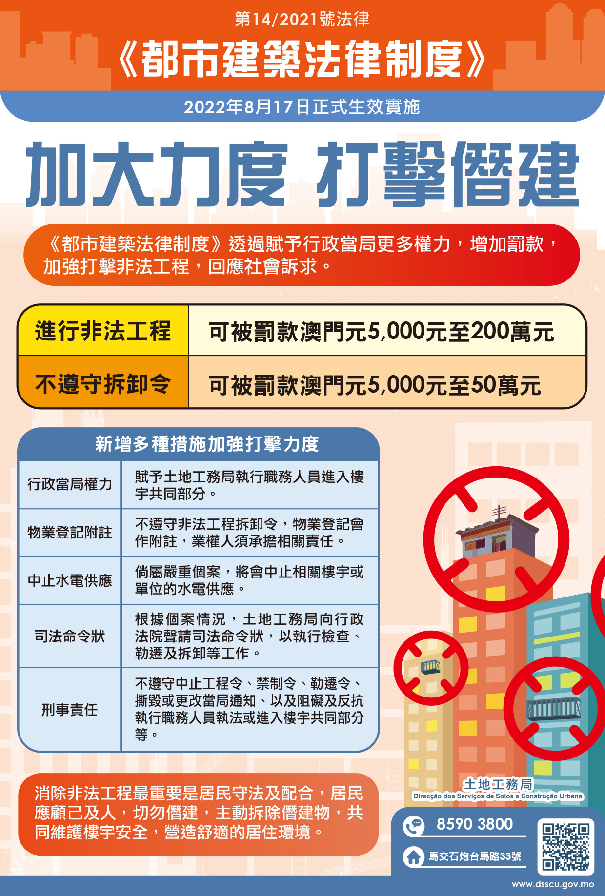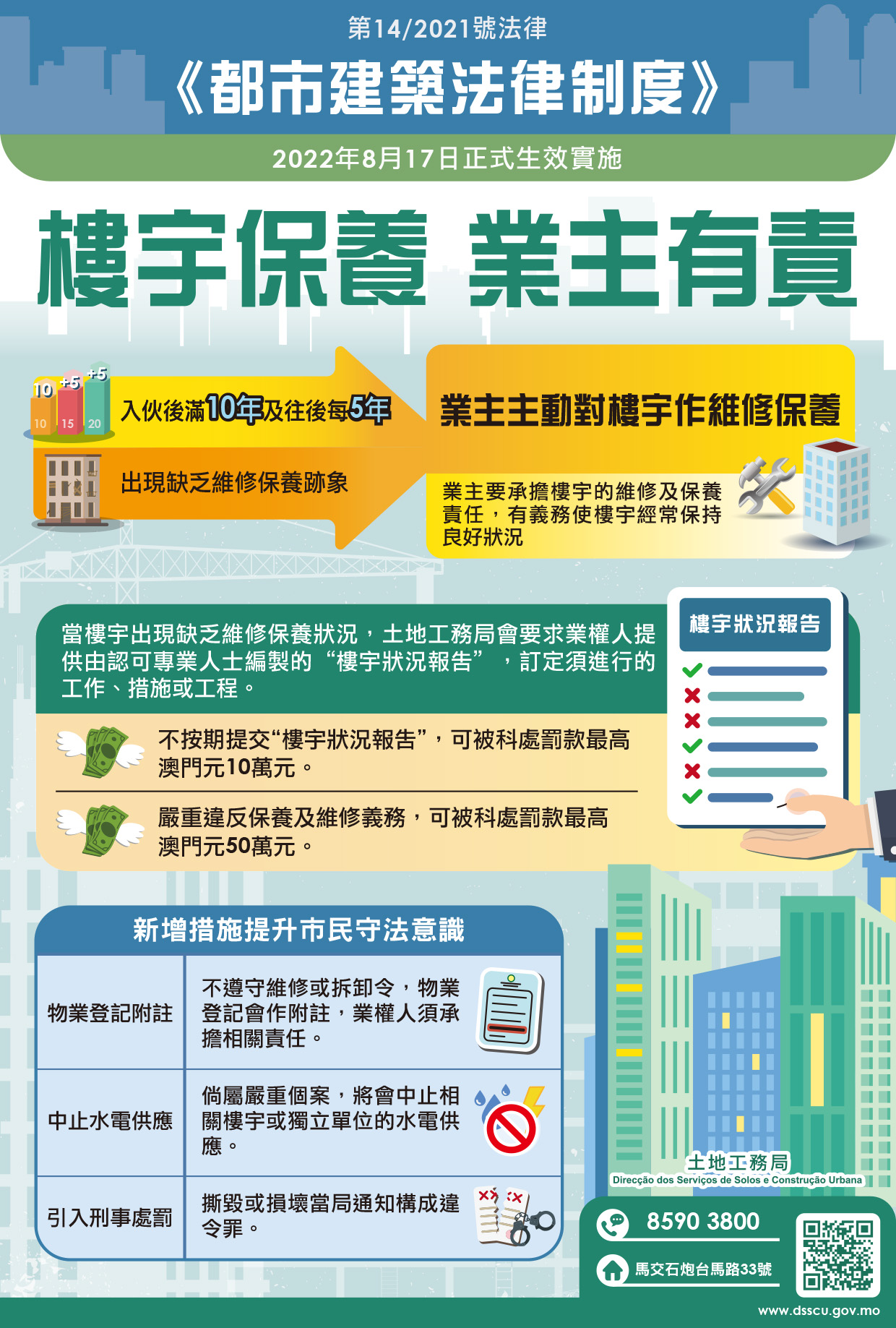 《都市建築法律制度》於2022年8月17日正式生效實施。 制度旨在配合澳門社會和建築業的迅速發展,訂定更配合社會現狀及建築發展趨勢的規範和相關程序,並加強對違規事項的監管力度,以便在保障公共利益的同時,更好地回應社會的實際需要。總體而言,新法主要優化審批工程計劃、發出工程准照程序,及對樓宇的維修保養、非法工程的監管等方面訂定明確的處理措施和相應的處罰程序。
