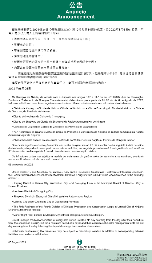 新型冠狀病毒感染應變協調中心(下稱應變協調中心)宣佈,因應內地的疫情變化,衛生局根據第2/2004號法律《傳染病防治法》第10條和第14條的規定,自2022年8月6日凌晨1時起,所有入境及已入境人士曾經到過以下地點: