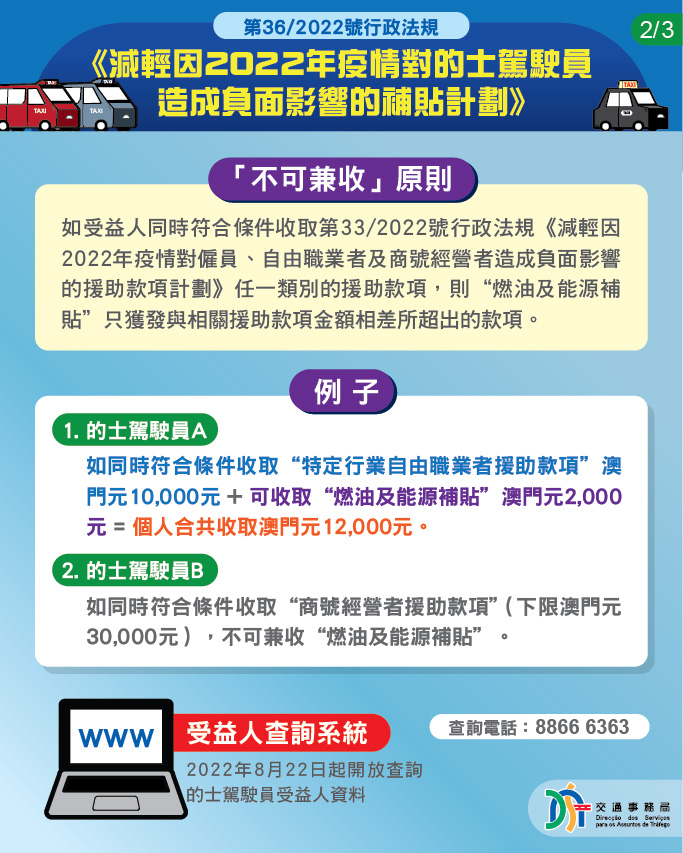 為減輕疫情對的士行業的負面影響,特區政府今(8)日公佈推出《減輕因2022年疫情對的士駕駛員造成負面影響的補貼計劃》。合資格的士駕駛員將獲發放最高澳門元12,000元的一次性燃油及能源補貼。但需要留意,如受益人同時符合條件收取《減輕因2022年疫情對僱員、自由職業者及商號經營者造成負面影響的援助款項計劃》任一類別的援助,則只會獲發與之相差多出的燃油及能源補貼款項,即澳門元2,000元。