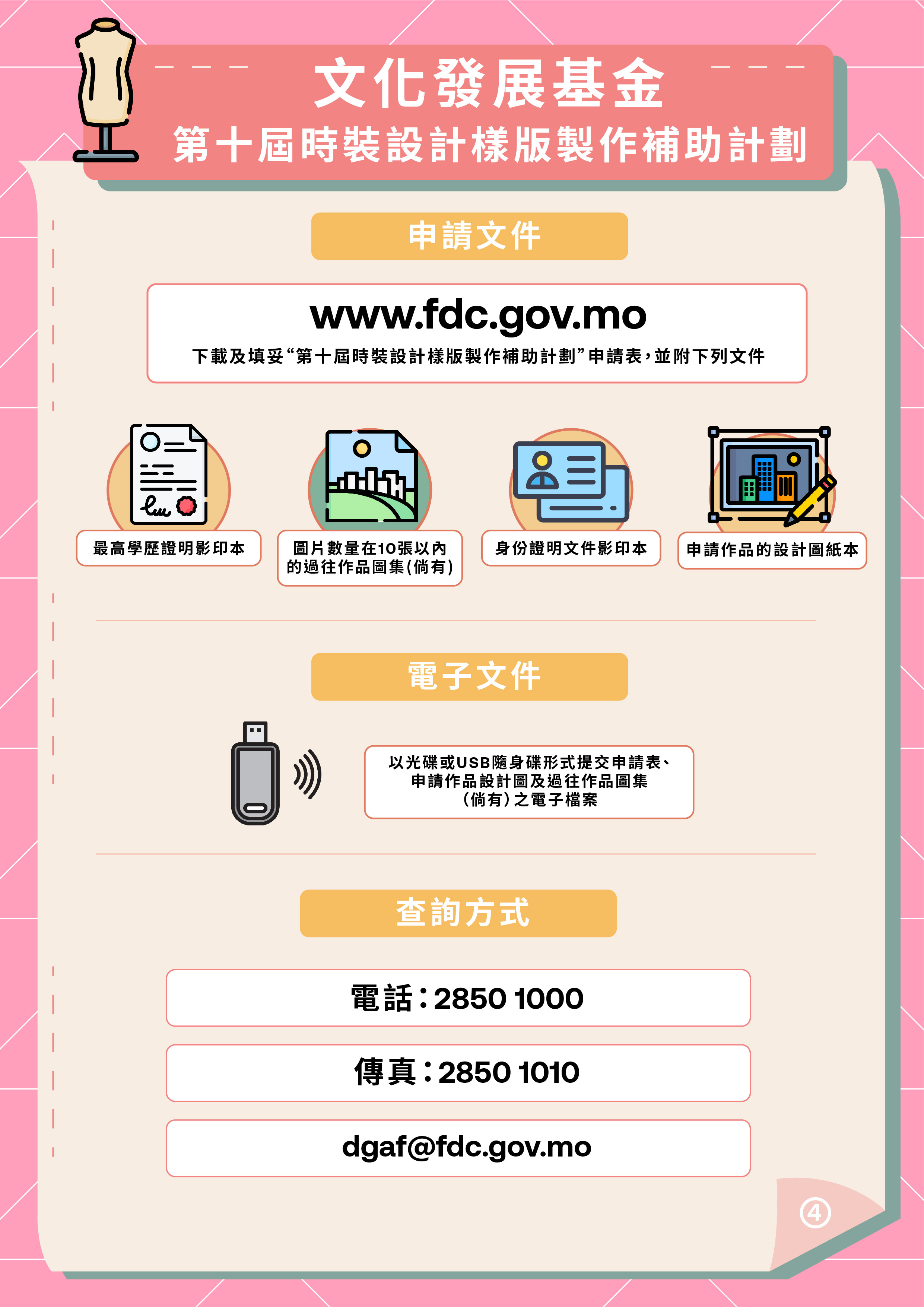 為詳細介紹“第十屆時裝設計樣版製作補助計劃”的申請事宜,文化發展基金將於8月12日下午3時舉行線上講解會及解答申請人問題,有興趣人士請於8月11日下午1時前,致電2850 1000或電郵dgaf@fdc.gov.mo向基金報名,基金將於稍後提供登錄鏈結,供參與人士於當天進入講解會線上頻道。