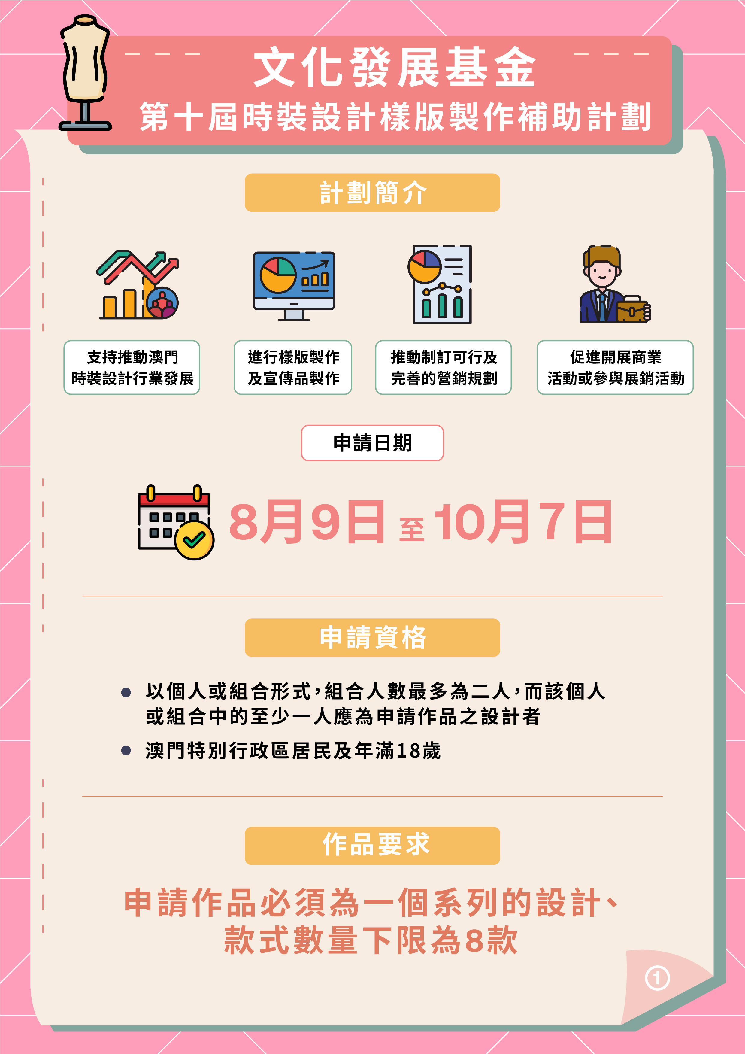 文化發展基金於8月9日至10月7日期間接受“第十屆時裝設計樣版製作補助計劃”申請,提供最多8個資助名額,支持業界開展時裝設計樣版及宣傳品製作。