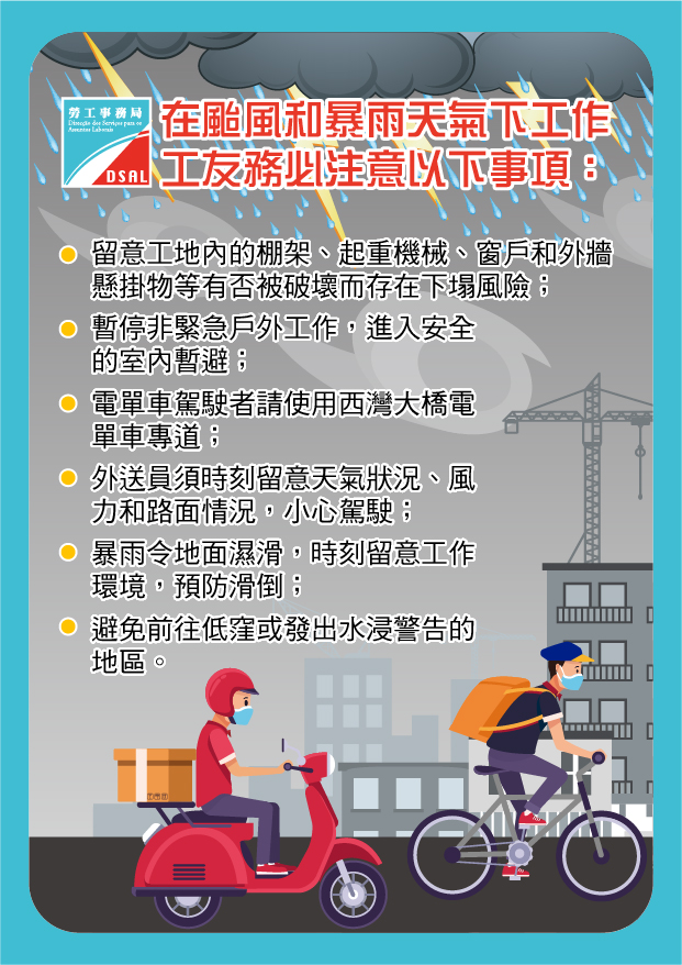 勞工局制定了《颱風及突發公共事件下之工作指引》供業界參考;另外,亦備有“工作場所應對颱風十「識」”海報,歡迎巿民索取和張貼於工作場所;如想了解更多職業安全健康的資訊,歡迎瀏覽勞工局「職安健天地」專題網頁( http://www.dsal.gov.mo/dsso/zh_tw/standard/index.html ),或致電28717781查詢。