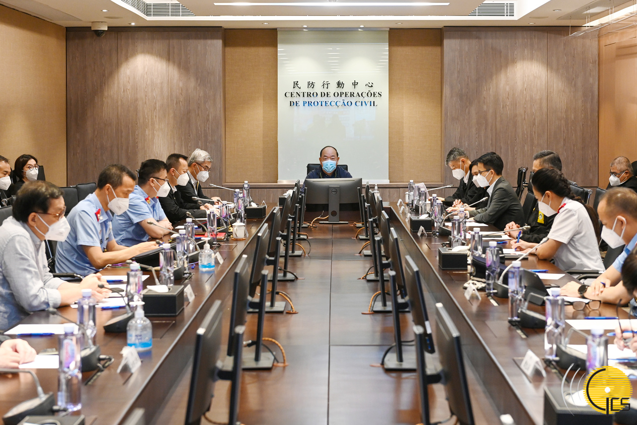 行政長官到達民防中心後,在保安司司長、聯合行動指揮官黃少澤,警察總局局長、輔助聯合行動指揮官梁文昌,海關關長黃文忠等陪同下,巡視了控制中心,隨後與民防架構部門領導及主管舉行工作會議。