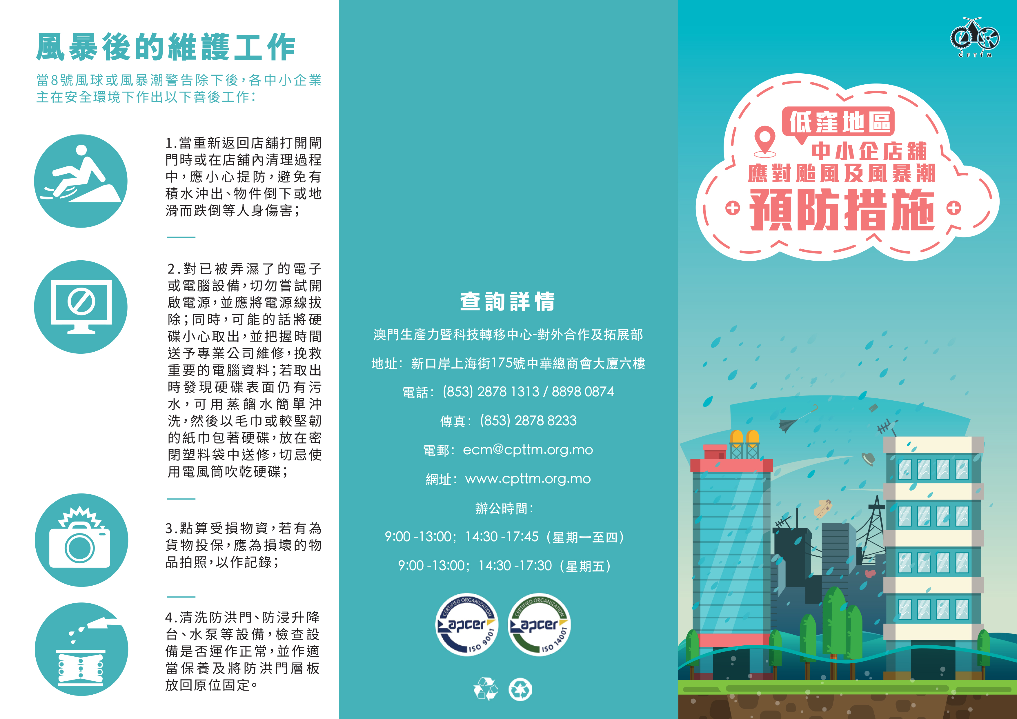 經濟及科技發展局和澳門生產力暨科技轉移中心再次提醒企業,特別位處低窪地區的商戶,應做好防風防洪防浸的準備工作及預防措施,以免造成貨物及設備損失。同時,商戶應密切留意氣象局發佈的最新天氣情況。
