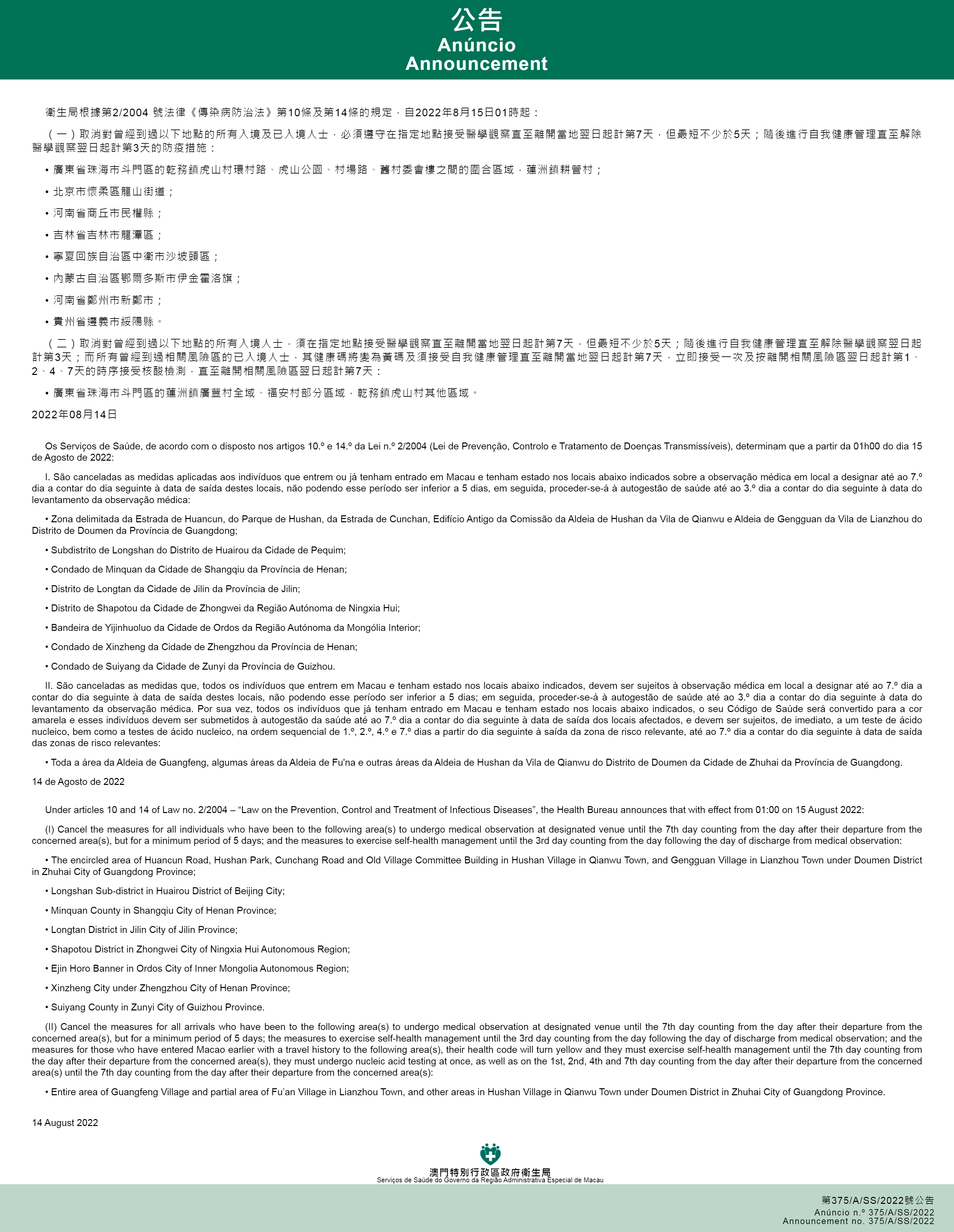 新型冠狀病毒感染應變協調中心(下稱應變協調中心)宣佈,因應內地的疫情變化,衛生局根據第2/2004號法律《傳染病防治法》第10條和第14條的規定,自2022年8月15日凌晨1時起,新增或取消對曾到內地相關區域人士的防疫措施: