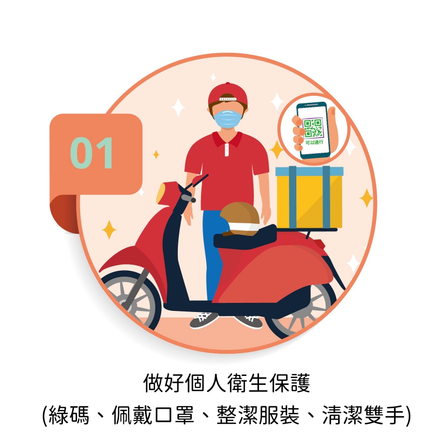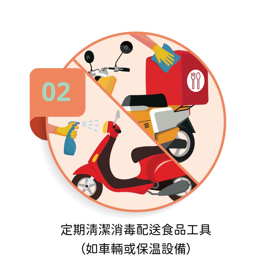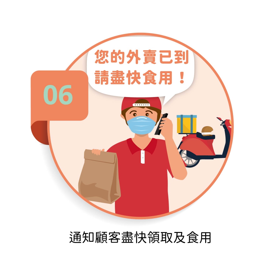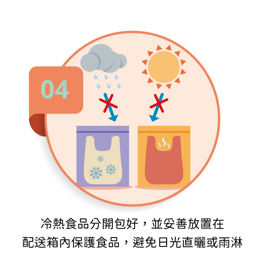 隨著外賣訂餐日漸普及,在配送外賣食品時,配送員除須遵守衛生防疫指引外,更須注意各項食品安全須知。將熱食存於保溫箱,生冷即食食品存於冷藏設備中,盡量避免長時間置放在炎熱天氣日曬雨淋,安全地把食品送到目的地。此外,亦須定期清潔消毒配送設備(如車輛及保溫箱等);配送員若身體不適,應暫停接觸食品及盡快求醫。