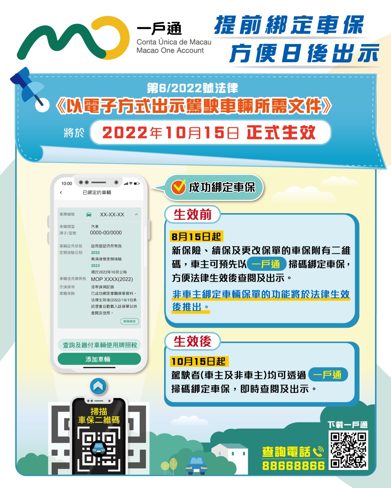 第6/2022號法律《以電子方式出示駕駛車輛所需文件》將於2022年10月15日起生效。屆時,駕駛者(車主和非車主)可選擇透過“一戶通”,以電子方式出示駕駛執照和民事責任保險證明文件(車保),效力等同紙本文件。同時,駕駛者將可免除攜帶車輛識別文件(登記摺)、所有權登記憑證(車契)、車輛通過定期或特別檢驗的證明文件。