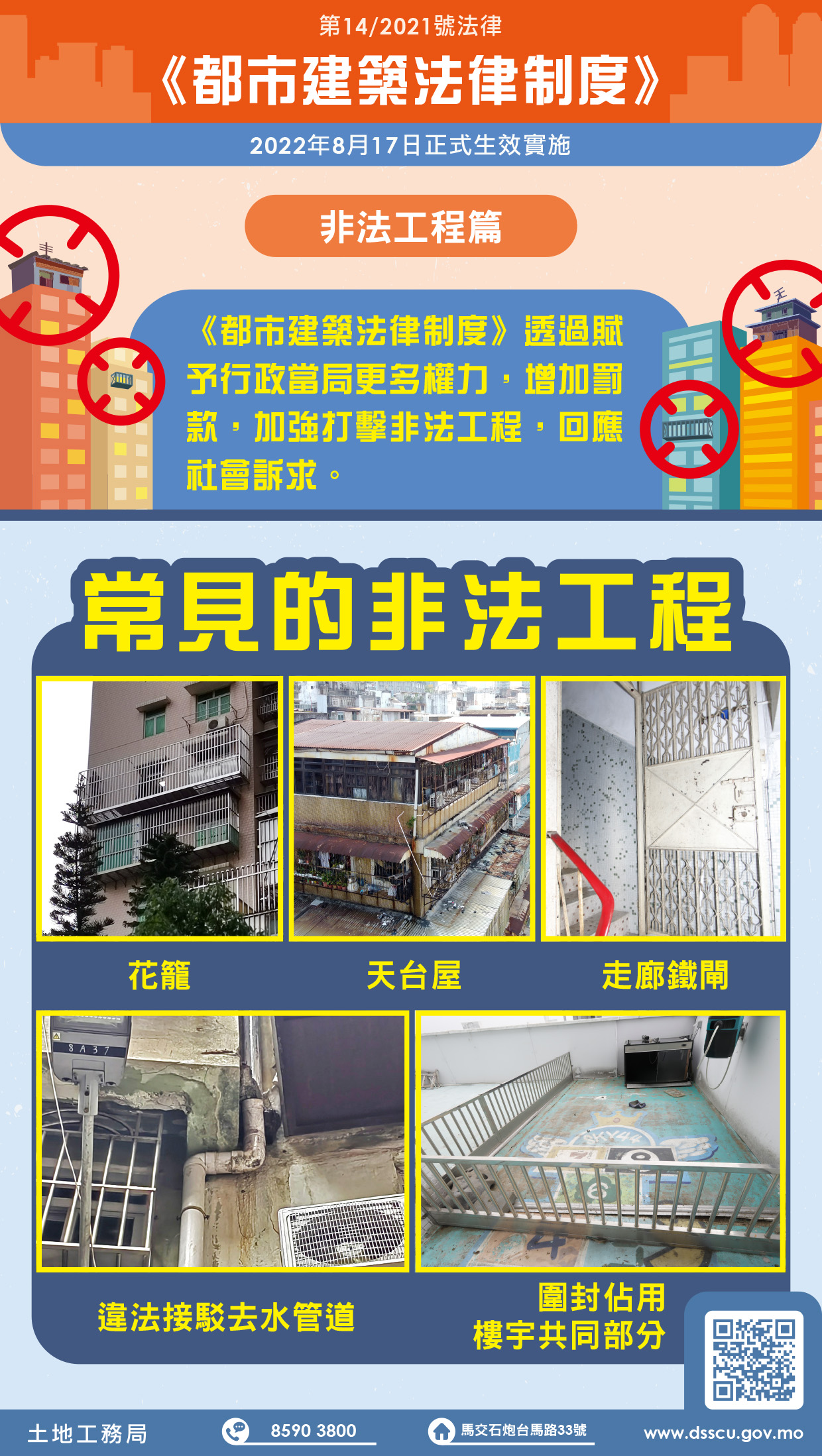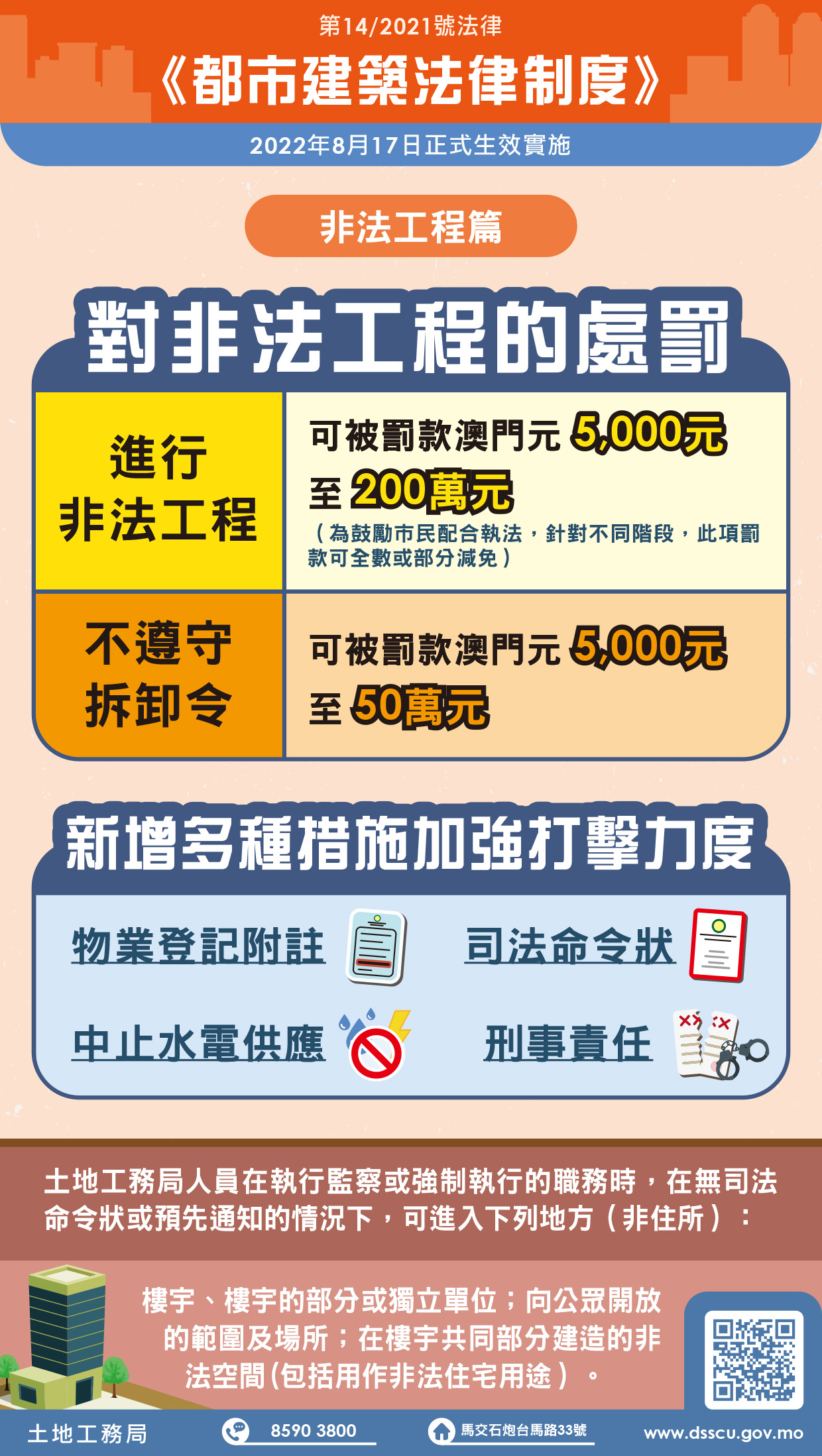 第14/2021號法律《都市建築法律制度》將於2022年8月17日起正式實施。針對處理非法工程,法律加大了罰款金額以加強打擊力度。其中,進行非法工程,違法人可被科處罰款,罰款金額自然人由澳門元五千元至一百萬元不等(法人更高至二百萬元);科處罰款不免除違法人拆除有關非法工程,倘違法人不遵守當局發出的拆卸令,尚可被科處罰款,金額由澳門元五千元至五十萬元不等。