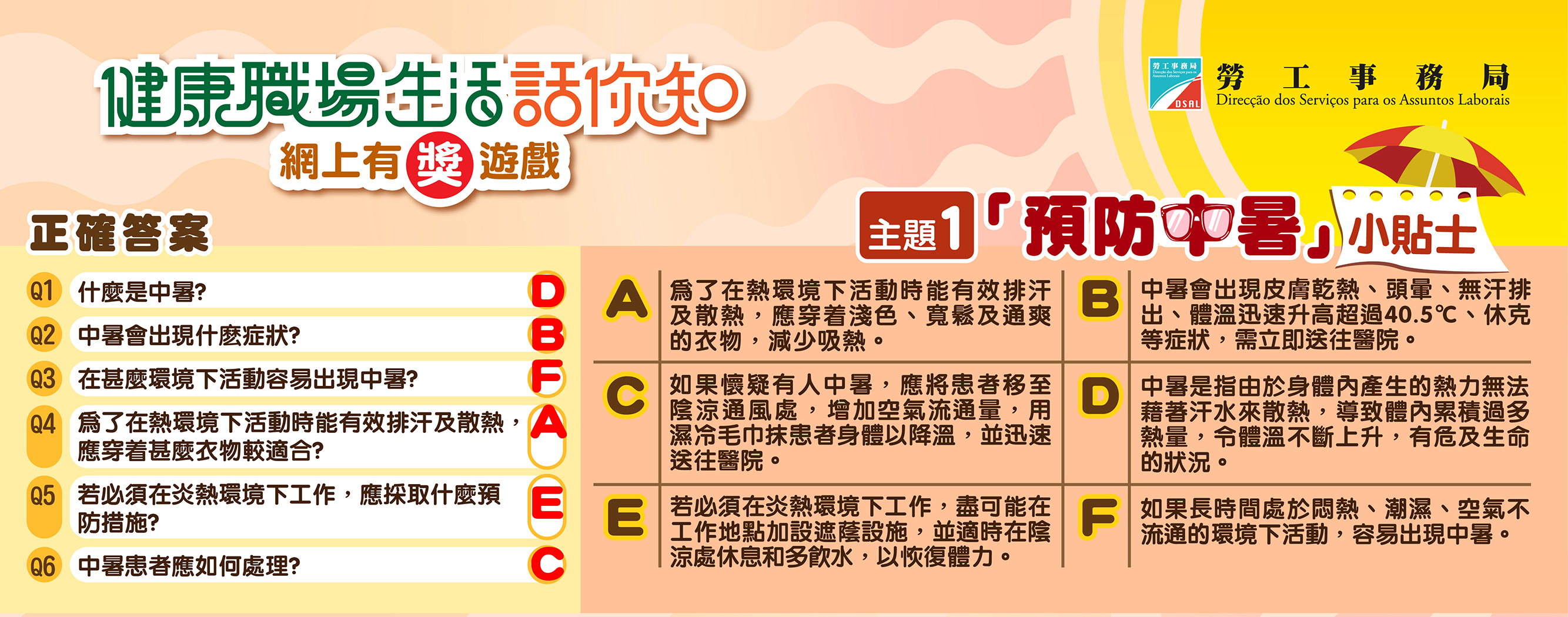 為持續提升巿民的職業安全健康意識,加強對工作安全和健康的關注,勞工事務局舉辦「健康職場生活話你知」有獎遊戲,主題為『預防中暑小貼士』,有關活動已於7月17日結束。是次活動反應熱烈,共有8,420人次參加,當中有8,240人次答對全部問題。勞工事務局於日前舉行抽獎儀式,隨機抽出30名得獎者,各得獎者可獲面值100元的超市禮券一張,有關得獎者將獲電話短訊通知。