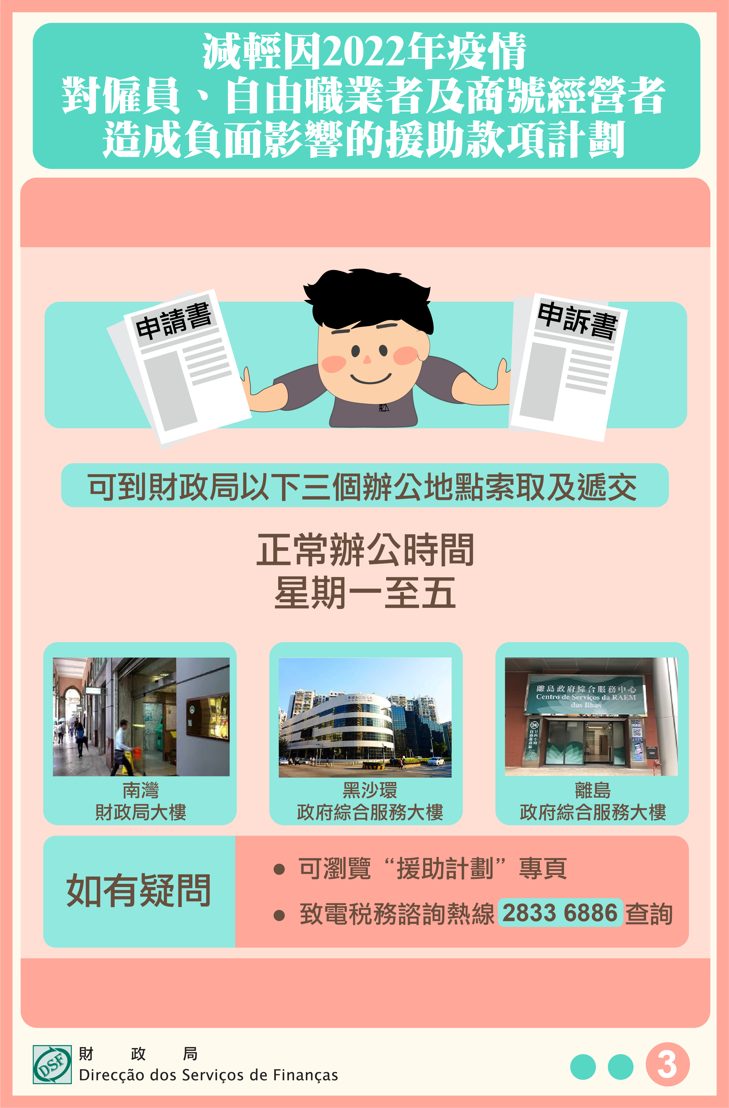 如有疑問,居民可瀏覽援助計劃專頁,又或致電稅務諮詢熱線2833 6886查詢,亦可於辦公時間內親臨南灣財政局大樓、黑沙環政府綜合服務大樓、離島政府綜合服務中心的財政局服務站點,查詢或遞交申請書及申訴書。