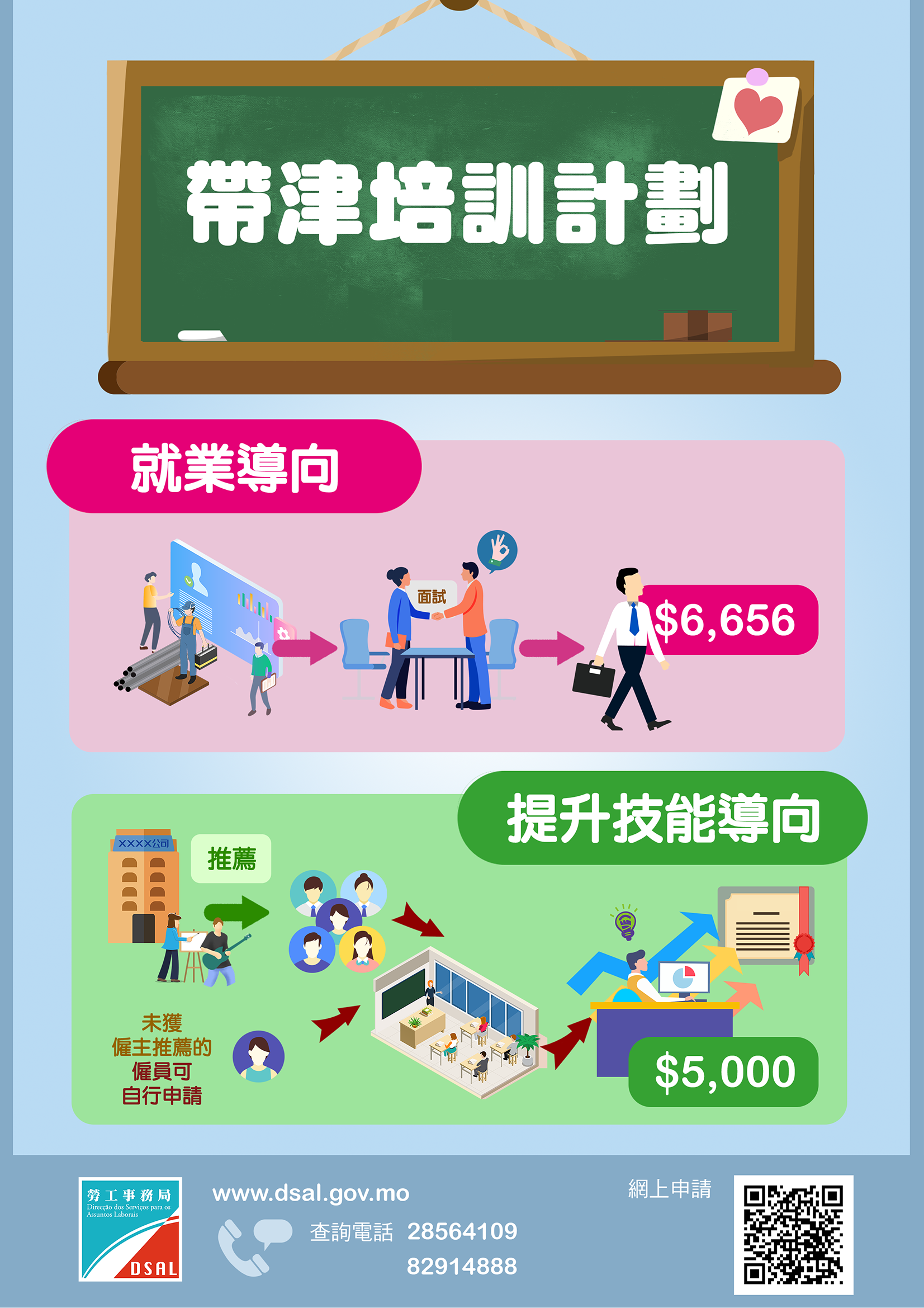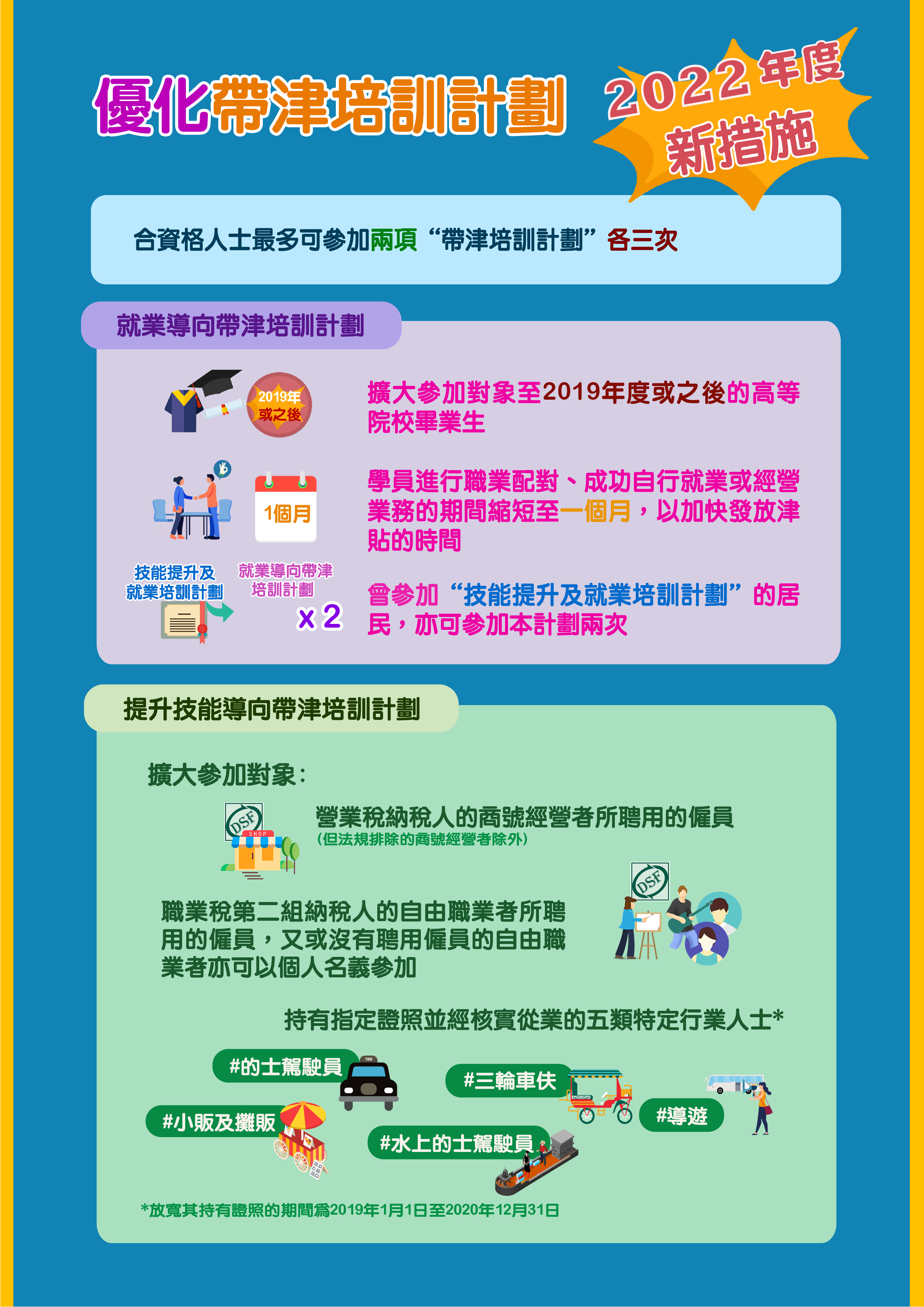 因受新冠肺炎疫情影響,7月份《帶津培訓計劃》暫停報名,第21輪課程將於8月22日至26日期間同時接受“提升技能導向帶津培訓計劃”及“就業導向帶津培訓計劃”報名。