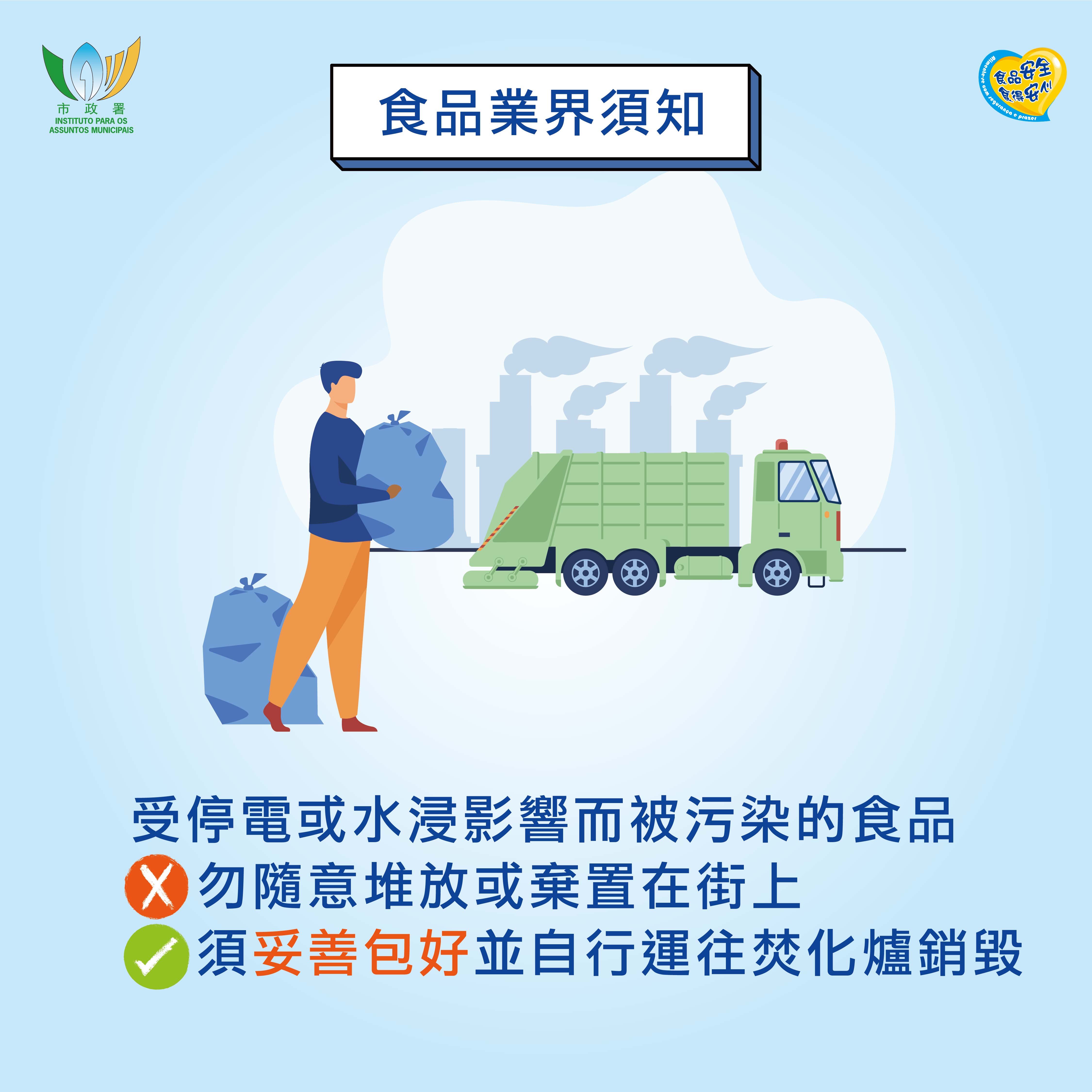 市政署已向低窪地區食品場所發出手機短訊提示,呼籲做好各項颱風食安風險防範措施,包括應將食品暫放於高位貯存等。同時提醒商戶,一旦食物受水浸或停電影響而被污染,應妥善包好並自行運往焚化爐銷毀,以防他人撿拾,切勿隨意堆放或棄置於街上。任何人士繼續加工、供應及出售廢棄、腐敗或變質的食品予他人食用,會觸犯《食品安全法》,最高可被罰款六十萬澳門元或監禁五年。如發現有關行為可致電市政署食安專線2833 8181舉報。