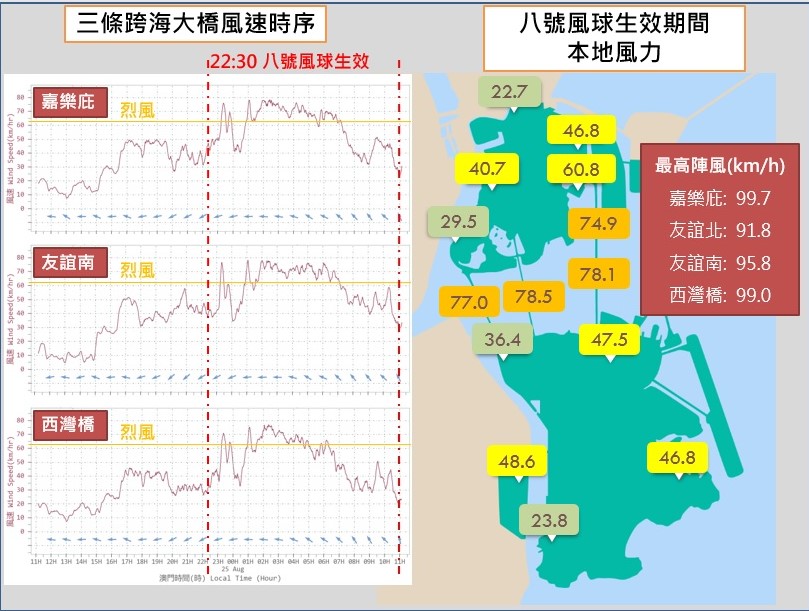 受熱帶氣旋「馬鞍」影響,本局於昨日(24日)晚上10時30分發出本年度第三個八號風球,期間三條大橋的最大10分鐘平均風速普遍錄得8-9級,最大陣風達10級(圖1)。隨著「馬鞍」於上午逐漸遠離減弱,本局於上午11時已改發三號風球。