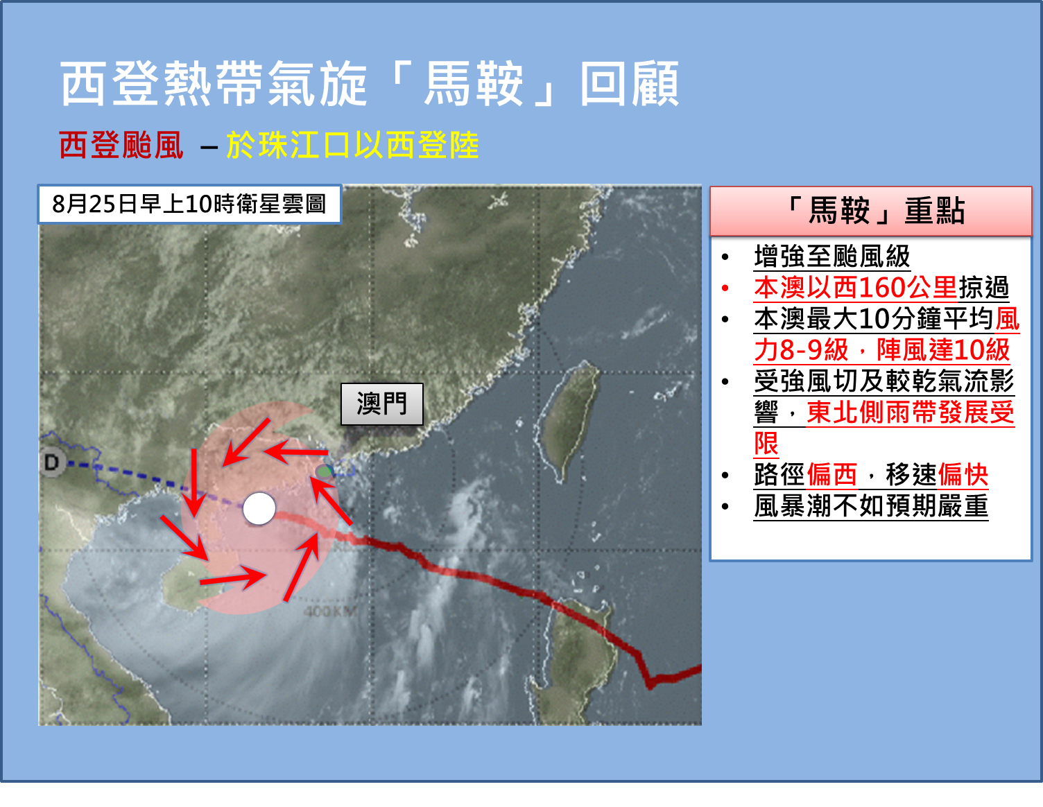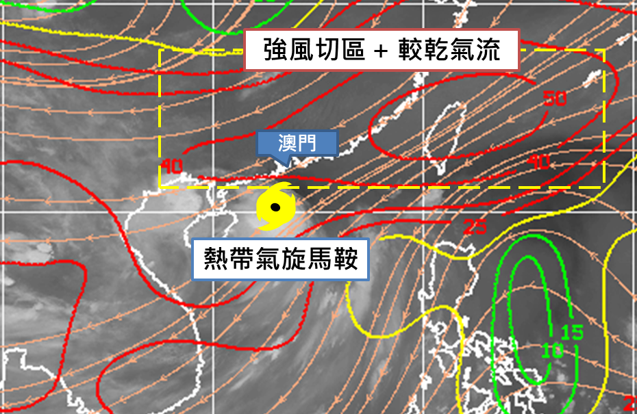 然而,「馬鞍」在移近廣東沿岸過程中,雖然增強至颱風級別,但由於南海北部垂直風切較大,加上「馬鞍」東北側受較乾之氣流影響(圖3),使得其東北側的雲雨帶發展受限,主要強雨帶集中其南側(圖4),而本澳位處其北側,由於雲雨帶結構不對稱,截至今日(25日)上午11時,八號風球期間,本澳各區普遍只錄得約10毫米累積雨量。