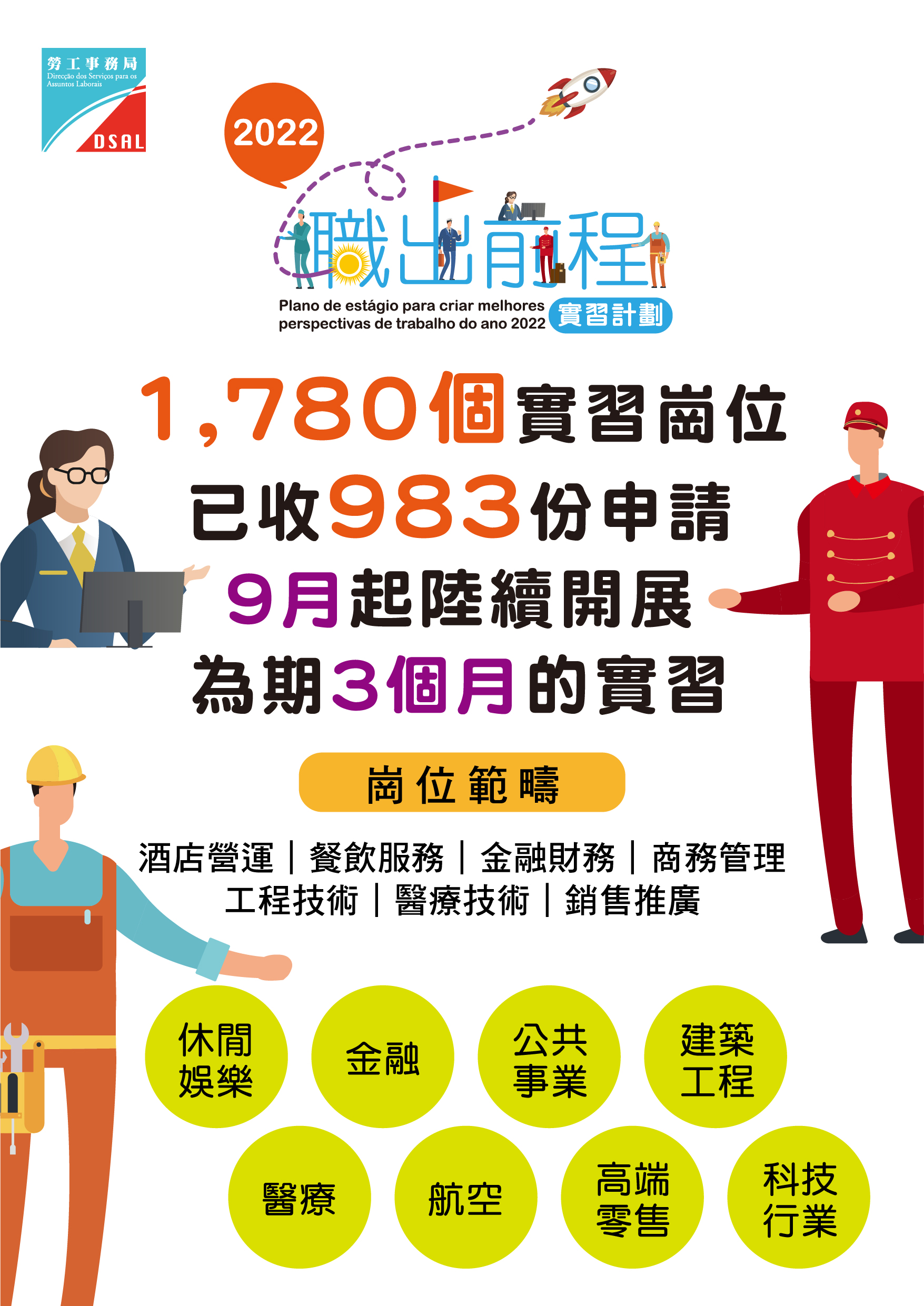 為協助應屆畢業生順利投入職場,勞工局今年繼續舉辦“職出前程”實習計劃,為青年朋友提供學習職場實務的機會。今年實習企業增至57間,較去年42間增加15間,覆蓋休閒企業、公共事業、銀行保險、建築工程、醫療護理、航空運輸、零售服務及科技等行業,共推出1,780個實習崗位供青年申請。