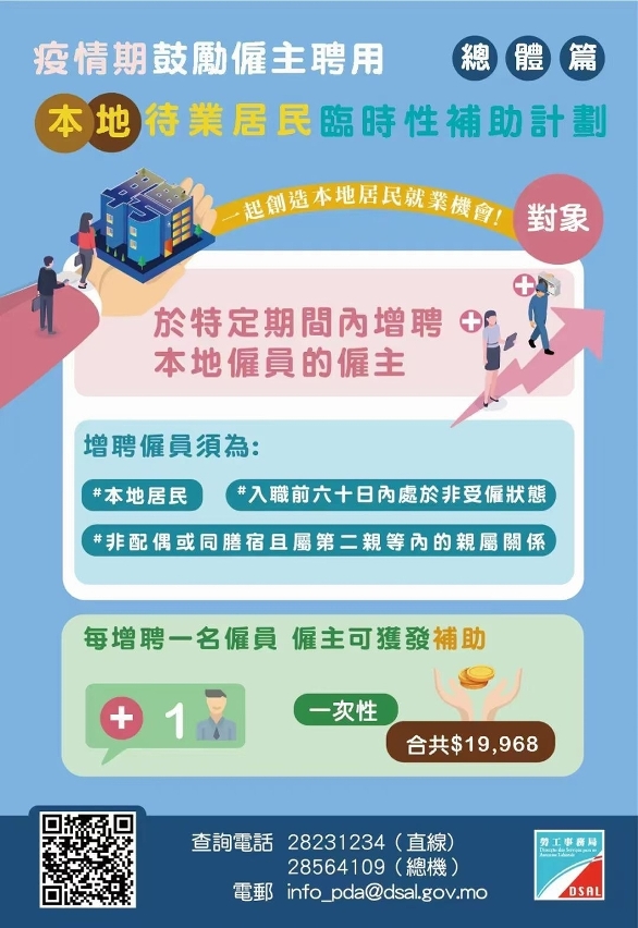 為協助待業居民就業,透過《疫情期間鼓勵僱主聘用本地待業居民的臨時性補助計劃》,符合資格的僱主在維持原有本地僱員數目的情況下,於6月1日至8月31日期間每增聘1名待業60日以上本地僱員,可獲得為期6個月,每月3,328澳門元的補助(即最高19,968澳門元),而申請名額不設上限。