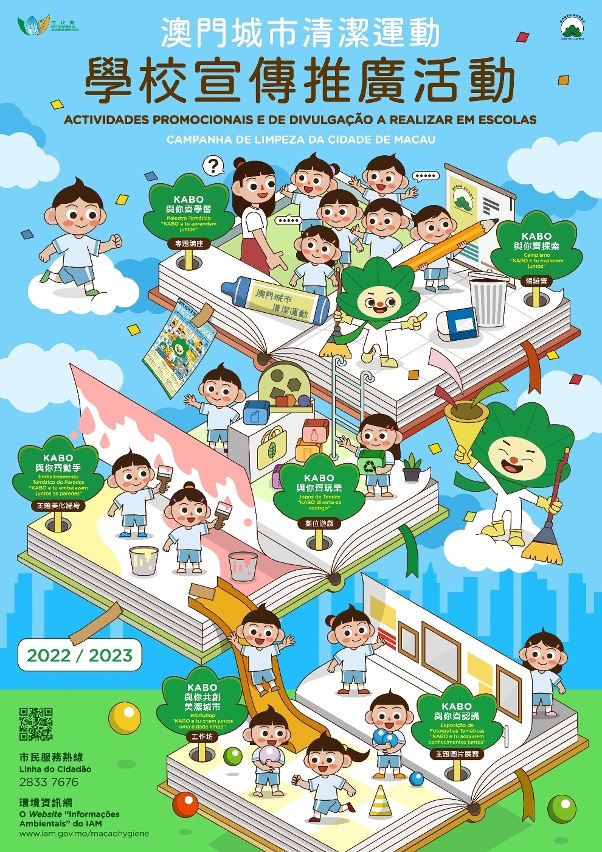 本學年的“澳門城市清潔運動之學校宣傳推廣活動”將重點推廣與《公共地方總規章》相關的內容,並以“澳門城市清潔運動”吉祥物KABO為主題,舉辦“KABO與你”系列活動,包括“KABO與你共創美潔城市”工作坊、“KABO與你齊玩樂”攤位遊戲、“KABO與你齊探索”體驗營、“KABO與你齊學習”專題講座、“KABO與你齊認識”主題圖片展覽,以及“KABO與你齊動手”主題美化牆身等活動,以迎合不同年齡層學生的興趣及需求。