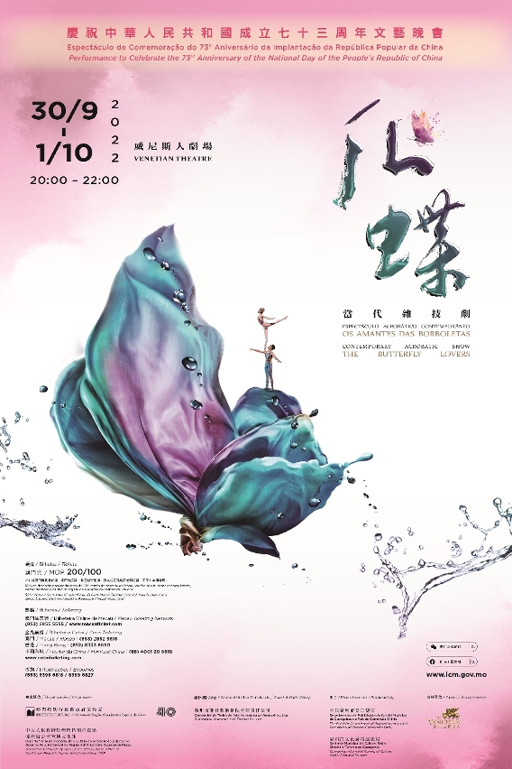 由澳門特別行政區政府文化局與中央人民政府駐澳門特別行政區聯絡辦公室宣傳文化部主辦,中共廣州市委宣傳部與廣州市文化廣電旅遊局出品,澳門威尼斯人支持,並由廣州市雜技藝術劇院有限責任公司擔演的“慶祝中華人民共和國成立七十三周年文藝晚會—當代雜技劇《化‧蝶》”,將於9月30日及10月1日晚上8時在威尼斯人劇場上演,藉著精湛雜技劇演出與市民歡度國慶,門票於本周五(9月2日)起公開發售。