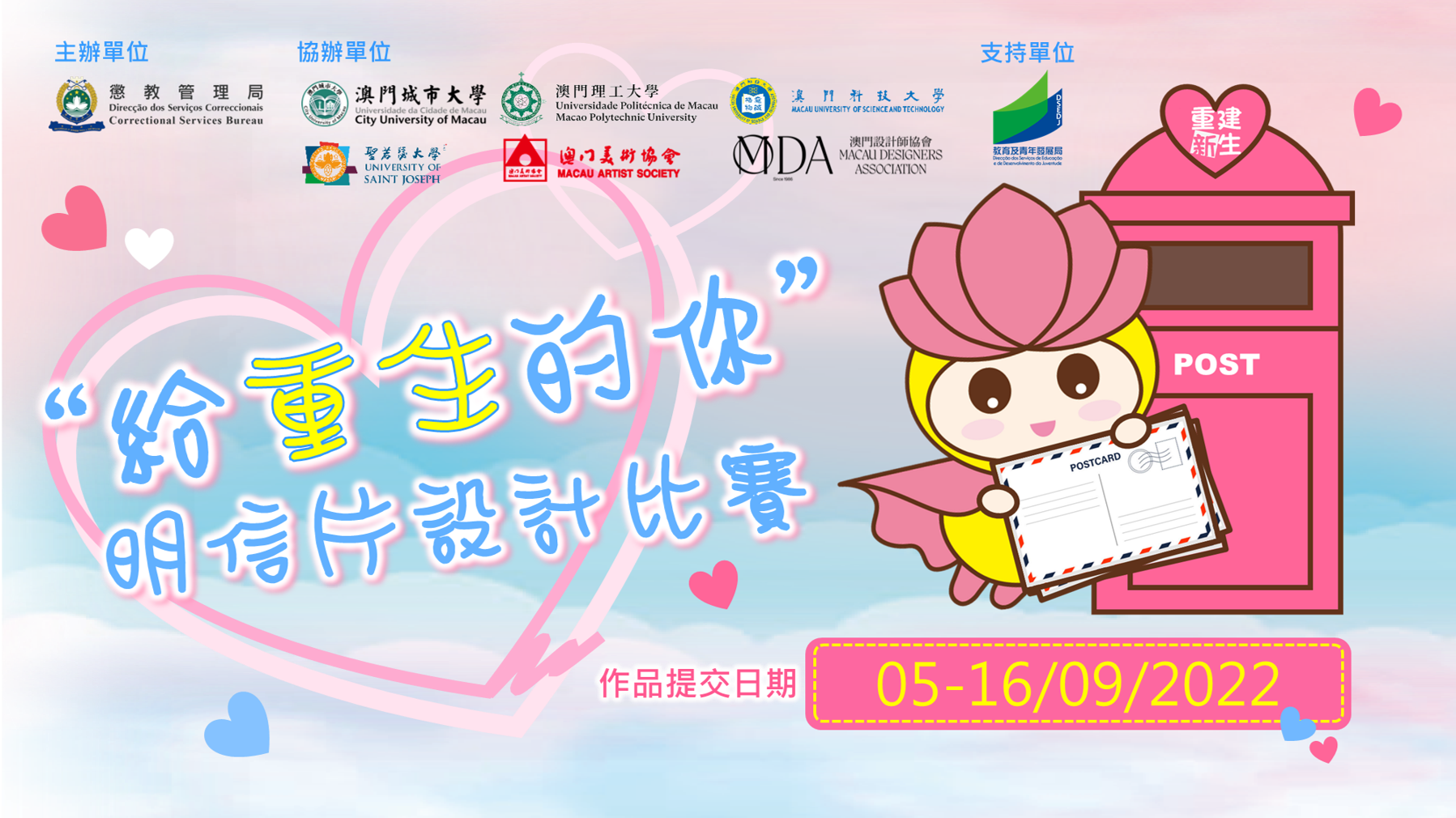 為積極推動社會大眾對在囚人及院生的關注,懲教管理局於本年5月13日至6月20日期間舉辦“給重生的你”明信片設計比賽,讓本澳學生共同參與。然而因疫情關係,比賽收件程序受到影響。為此,經比賽評審商議後,現再開放時間予參賽者遞交或補交作品,日期為9月5日至9月16日,同時,也讓已完成交件程序的參賽者對作品進行任何倘有的修改。