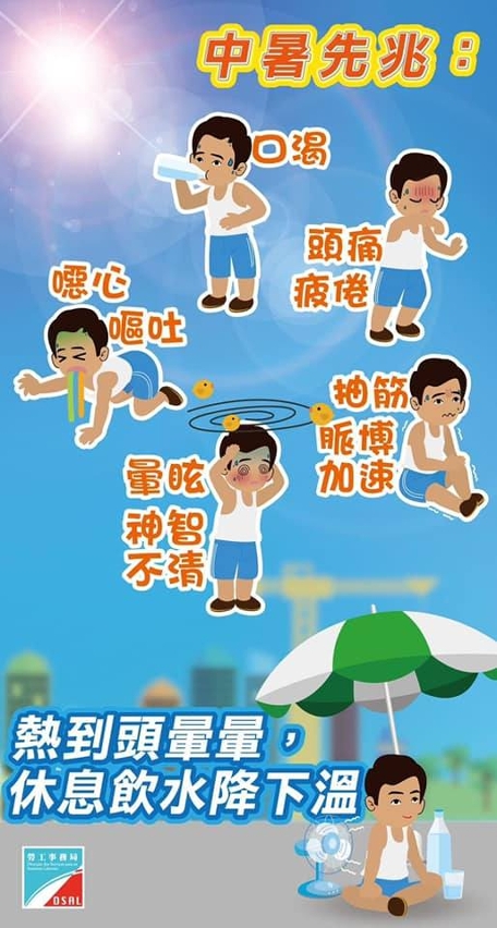 勞工局呼籲工友做好預防中暑措施。包括: