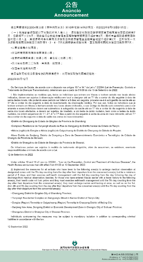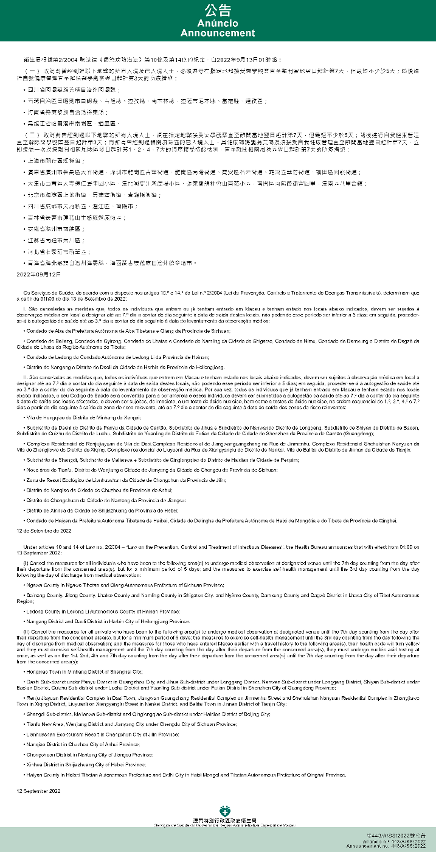 新型冠狀病毒感染應變協調中心(下稱應變協調中心)宣佈,因應內地的疫情變化,衛生局根據第2/2004號法律《傳染病防治法》第10條和第14條的規定,自2022年9月13日凌晨1時起,新增或取消對曾到內地相關區域人士的防疫措施: