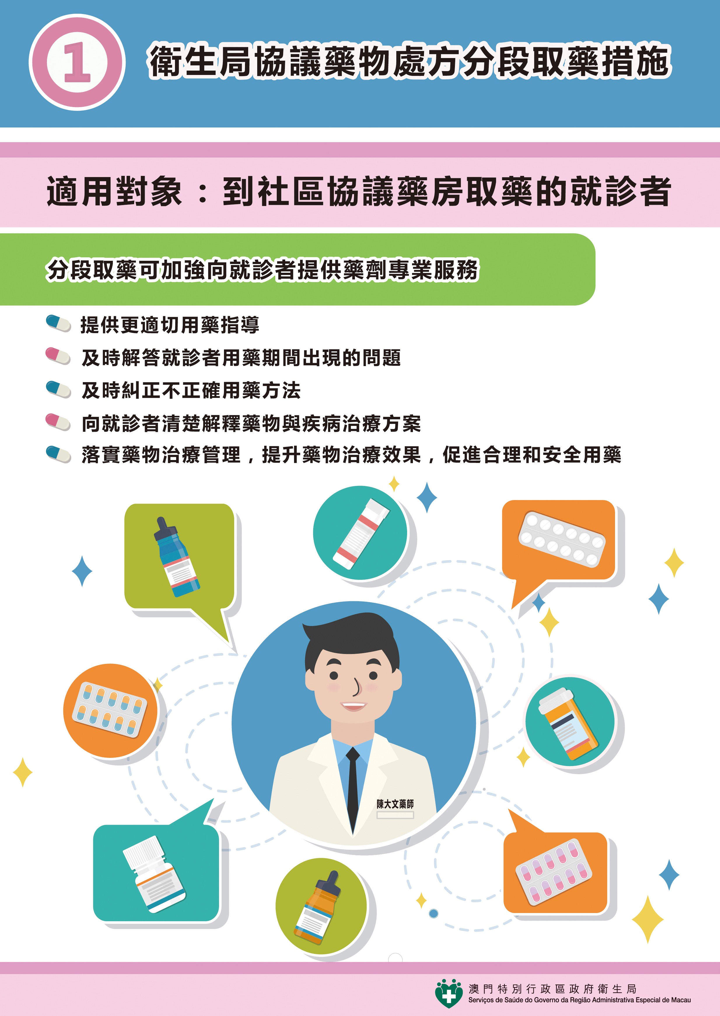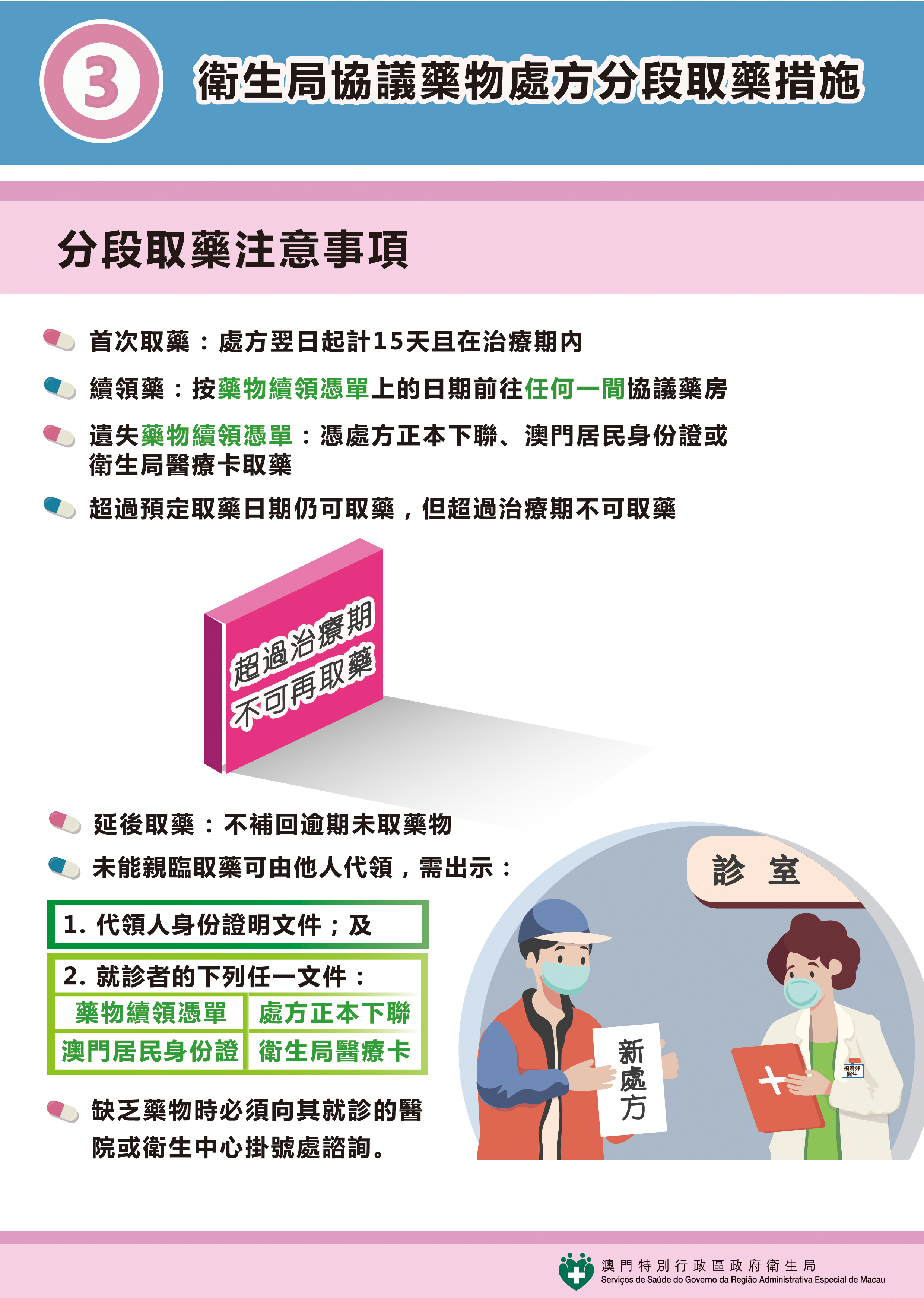 協議藥物處方分段取藥措施明(16)日起正式實施, 目的是讓就診者對藥物治療有更深入了解,推動安全用藥,減少藥物囤積家中造成浪費;加強藥劑師與就診者之間的接觸和溝通,及早發現就診者的服藥問題,以便適時介入,提高藥物治療效果,從而提升藥劑專業服務。衛生局再次提醒就診者留意該項措施內容,具體如下: