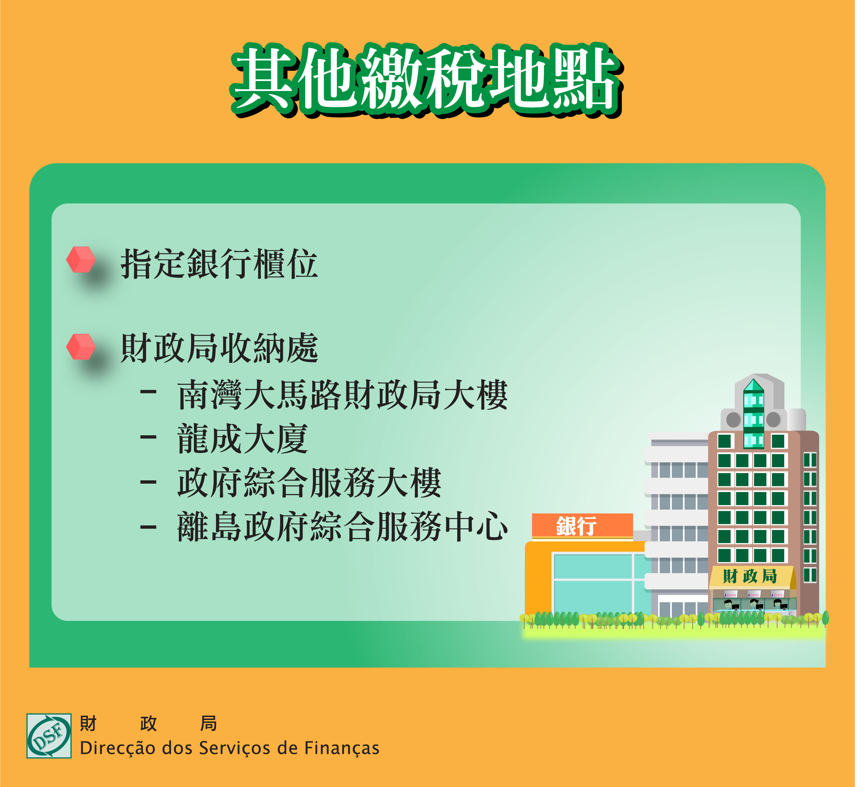| 財政局大樓及龍成大廈 | 星期一至星期四(9:00-18:00) 星期五(9:00-17:45) |