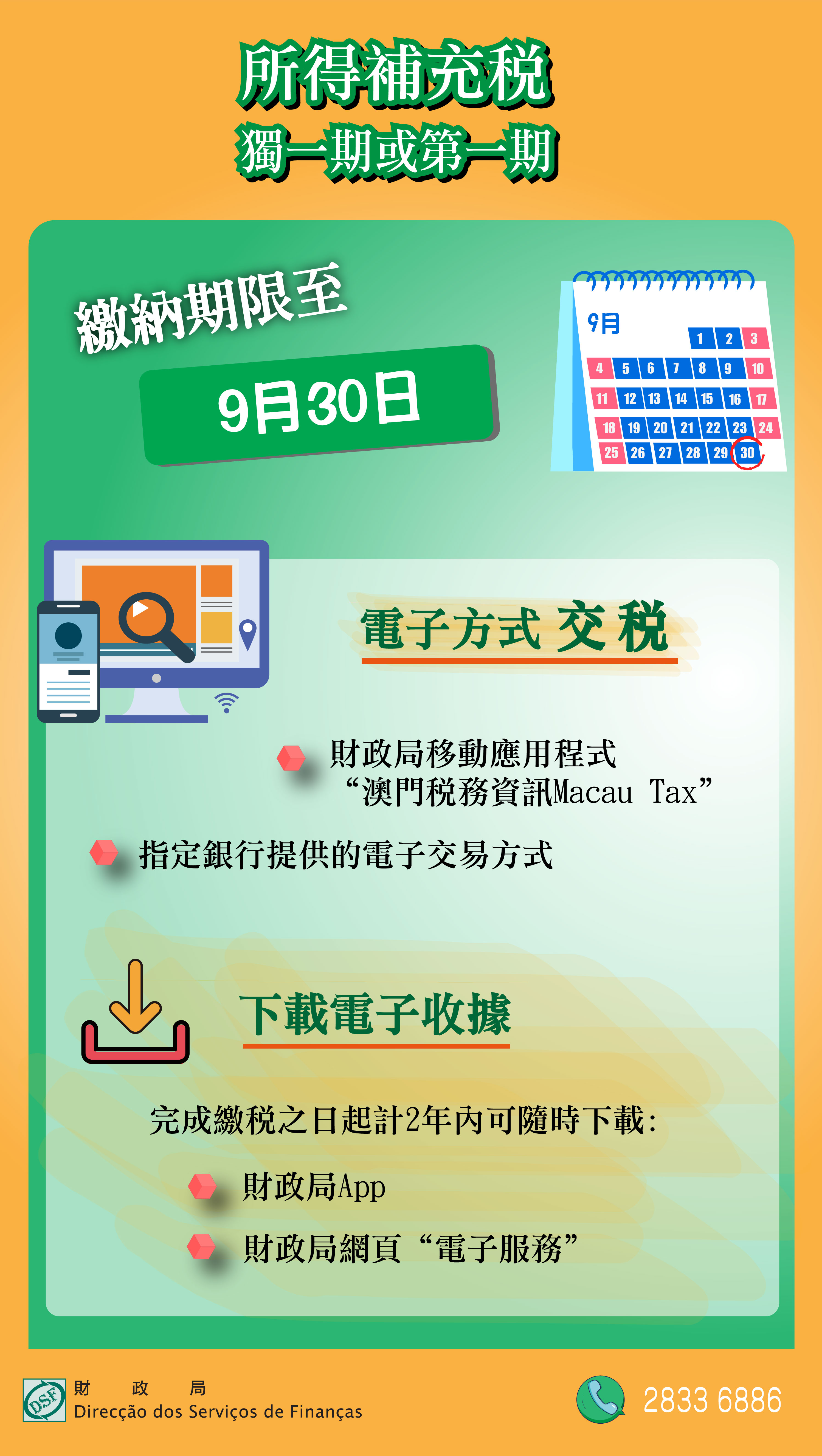 財政局提醒納稅人,繳納月份為9月的獨一期或第一期之所得補充稅,繳納期限至9月30日止,若第一期不按規定於9月份內繳納,將加徵過期利息及欠繳稅款百分之三,並引致第二期立即到期。