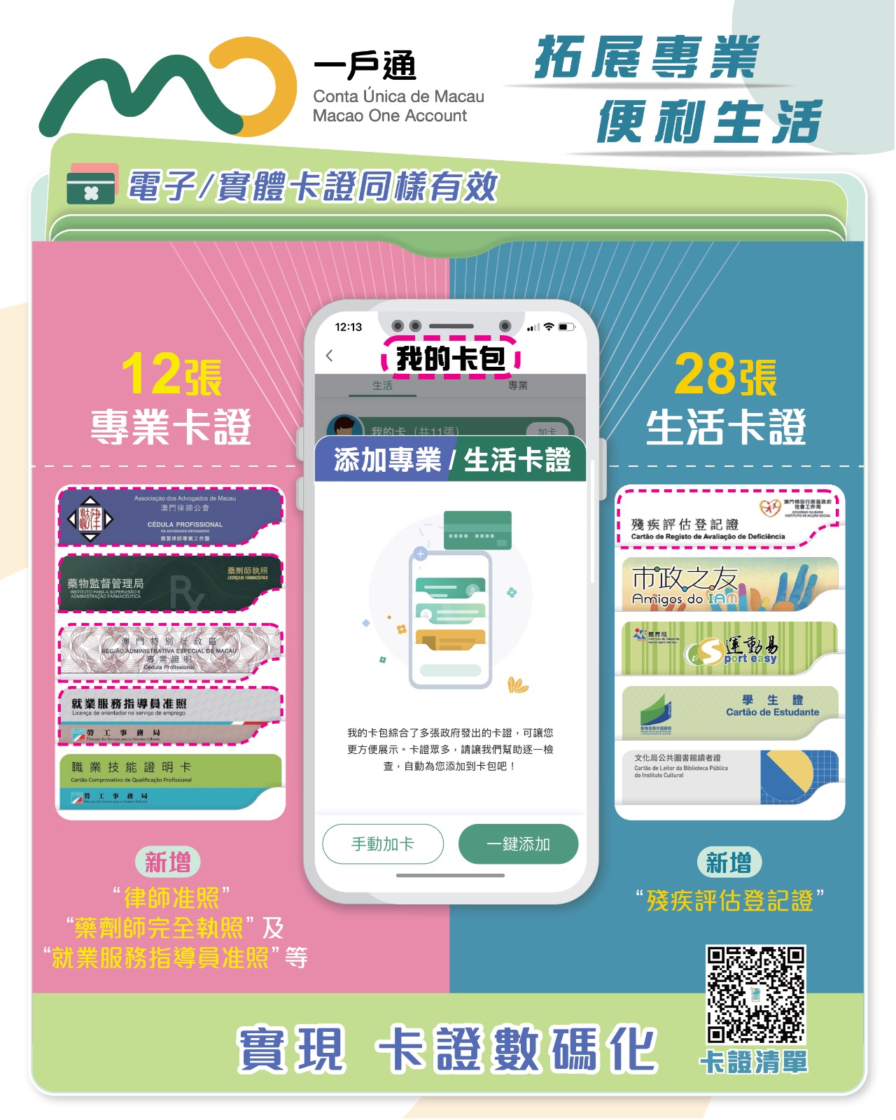 詳細卡證清單請瀏覽“一戶通”專題網站(https://www.gov.mo/zh-hant/app/),或掃描圖文包二維碼獲取資訊。