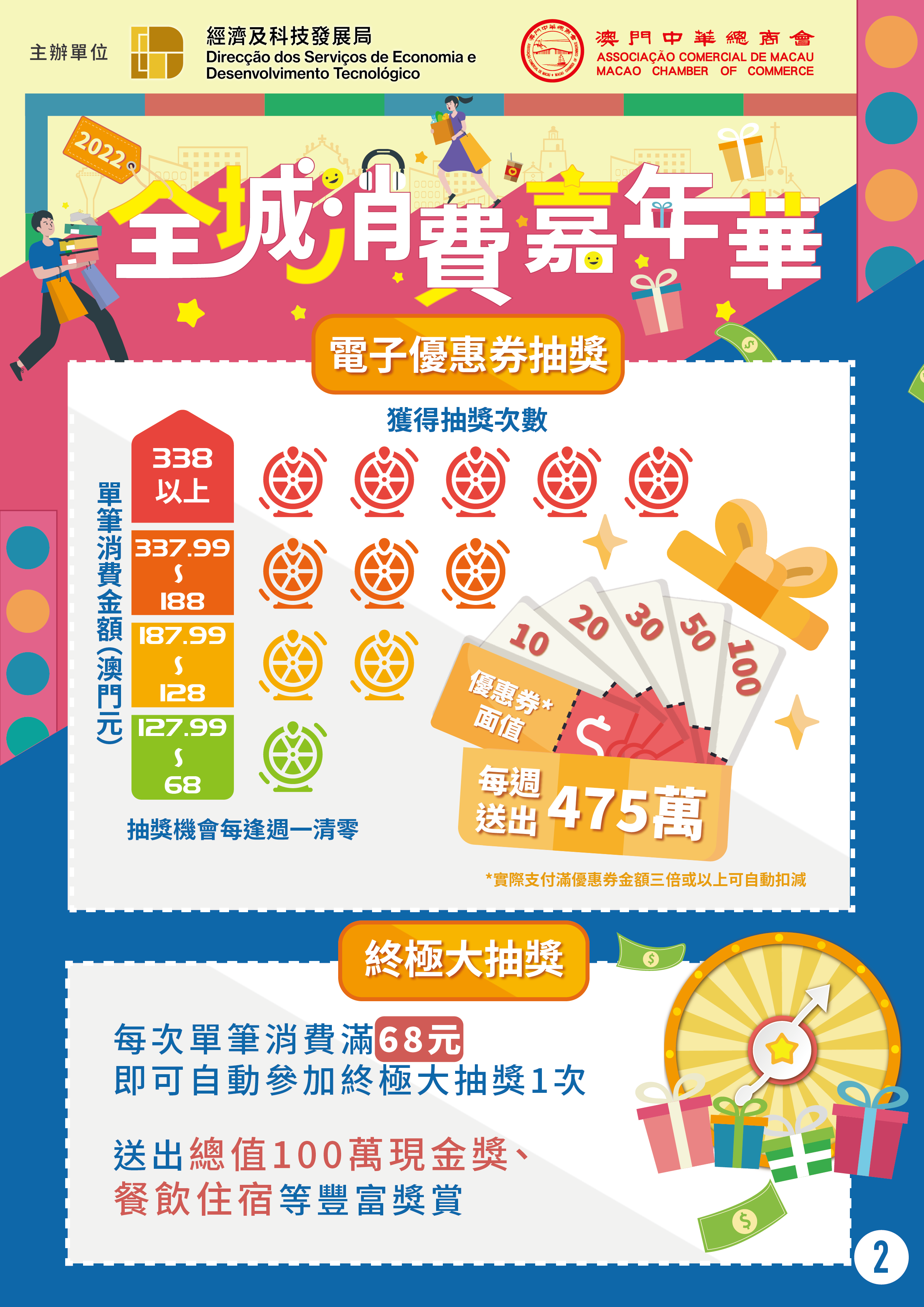 “2022年全城消費嘉年華"將於10月15日正式推出,直至明(2023)年2月28日,活動為期長達20週。活動獎金獎品總值近1億澳門元,活動期間,通過實名認證的電子錢包用戶於全澳線下大部分實體店舖消費時,透過移動支付單筆實付滿68元(澳門元,下同),即可獲得抽獎機會獲取電子優惠券,更可於活動結束後參加終極大抽獎。終極大抽獎獎品豐富,包括總值高達100萬元現金、餐飲住宿等。