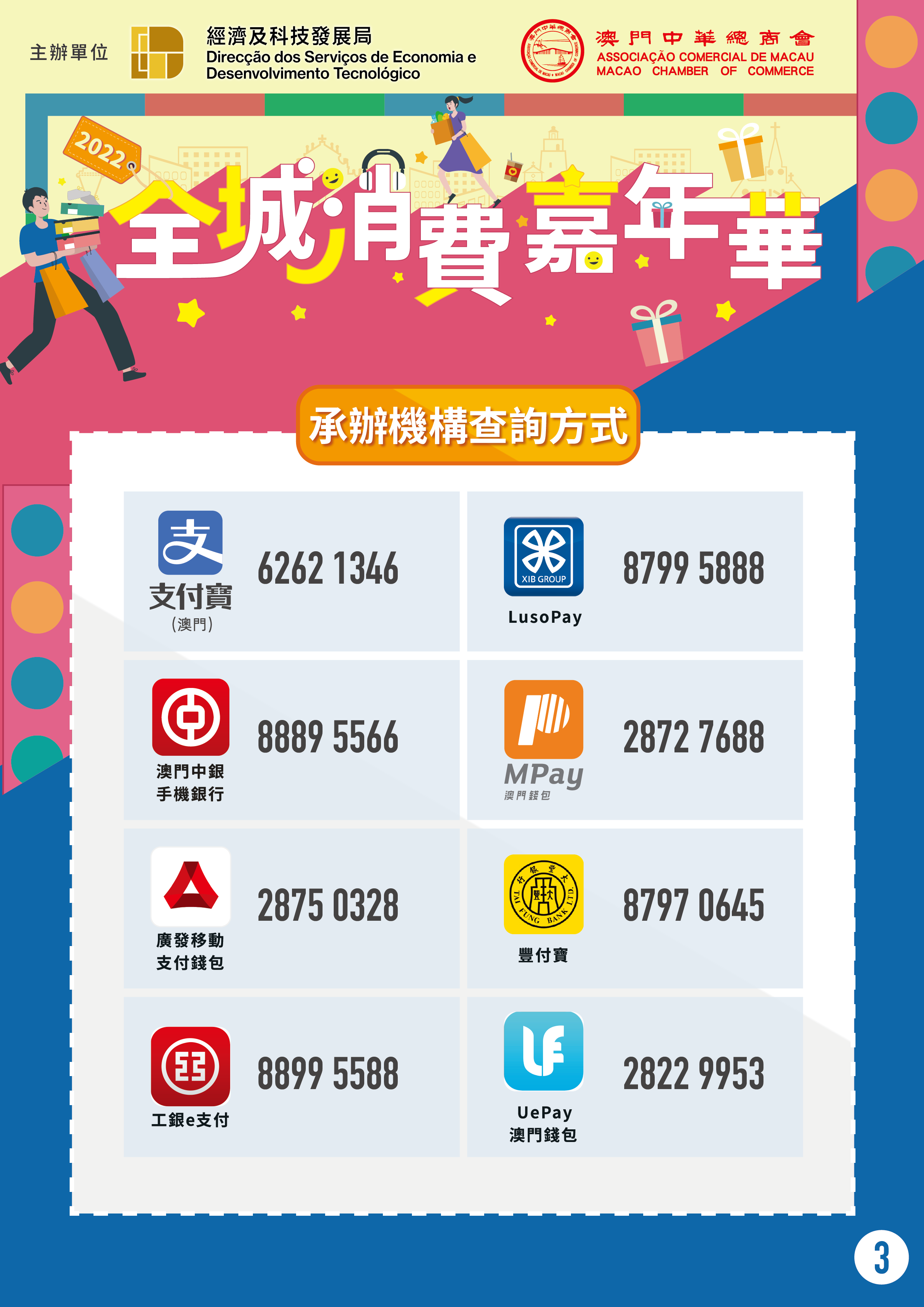 經科局自2016年起,與不同地區商會合作舉辦“社區消費嘉年華”系列活動,並取得一定成效。在此基礎上,“2022年全城消費嘉年華"將擴大活動規模及覆蓋面,在本澳多個地區商會及行業協會的配合和8家支付機構的支持下,將串聯起各行各業共同參與,預計參與商戶將超過2萬家。