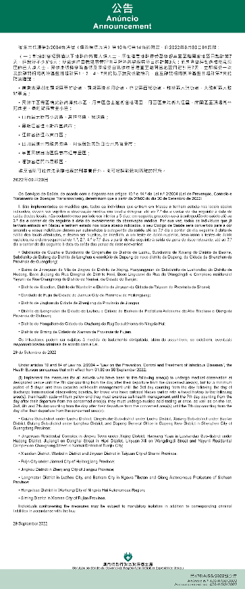 新型冠狀病毒感染應變協調中心(下稱應變協調中心)宣佈,因應內地的疫情變化,衛生局根據第2/2004號法律《傳染病防治法》第10條和第14條的規定,自2022年9月30日凌晨1時起,新增或取消對曾到內地相關區域人士的防疫措施: