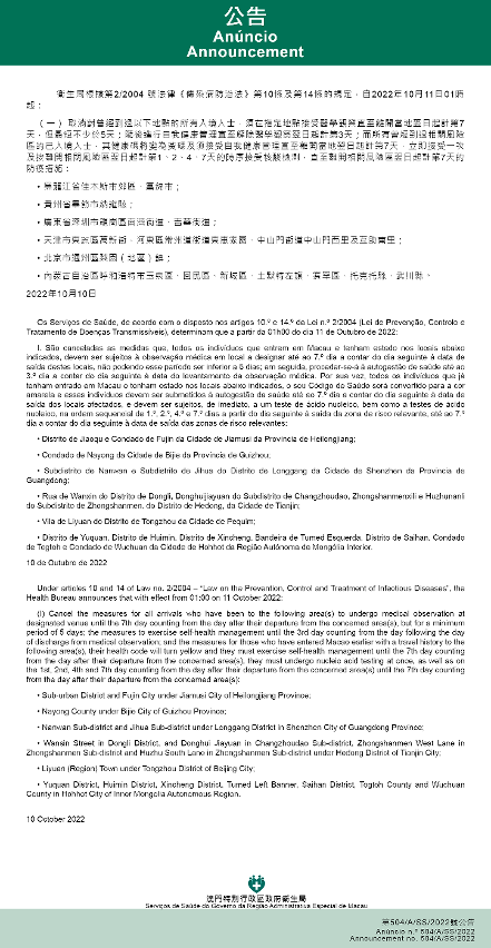 新型冠狀病毒感染應變協調中心(下稱應變協調中心)宣佈,因應內地的疫情變化,衛生局根據第2/2004號法律《傳染病防治法》第10條和第14條的規定,自2022年10月11日凌晨1時起,新增或取消對曾到內地相關區域人士的防疫措施: