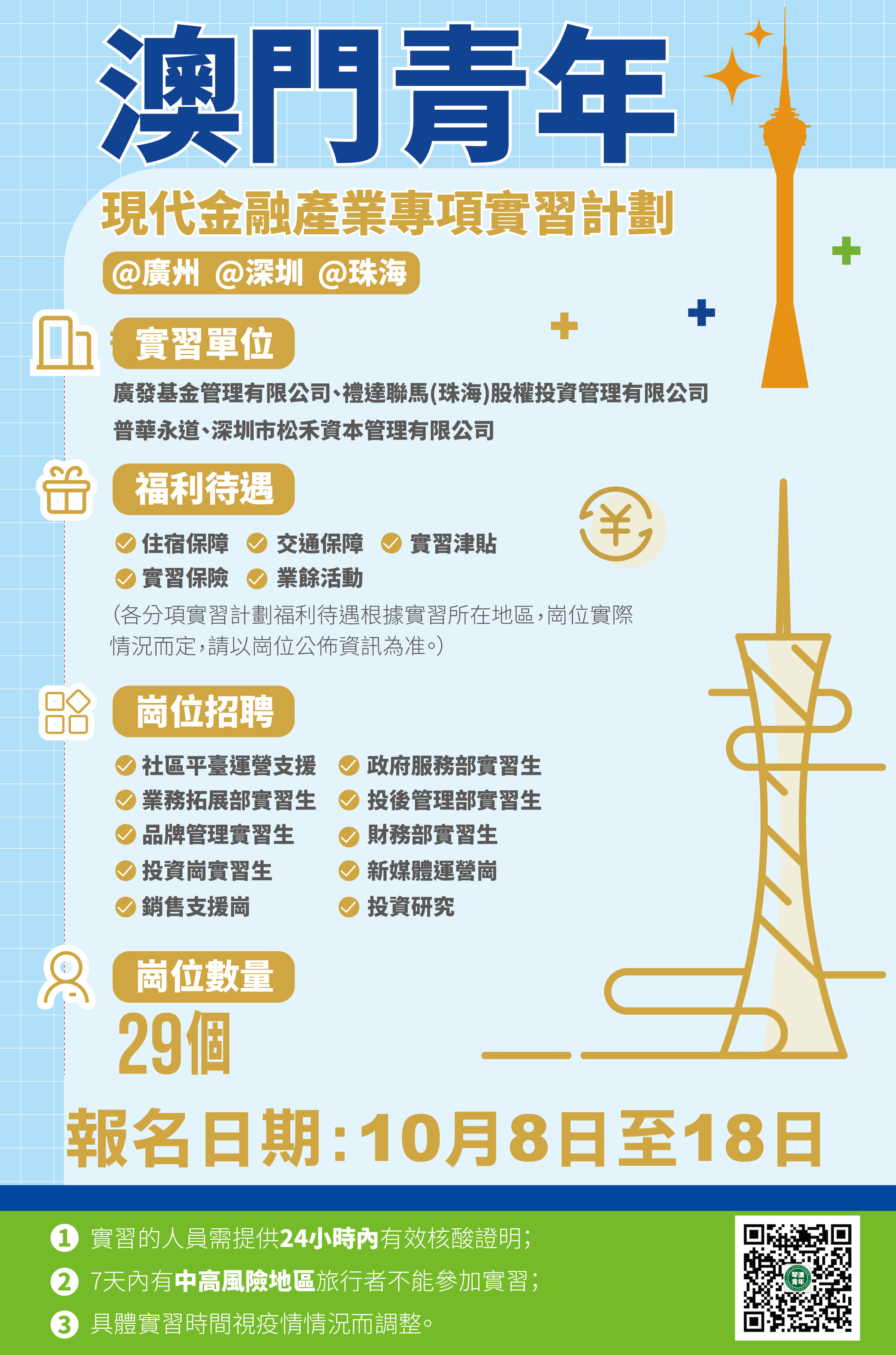 為讓澳門青年了解內地現代金融產業,培養更多具備專業金融產業職業技能人才,勞工事務局與橫琴粵澳深度合作區民生事務局(下稱“橫琴民生局”)及橫琴粵澳深度合作區金融發展局合作推出「澳門青年現代金融產業專項實習計劃」,合共提供29個實習崗位,由即日起至10月18日接受申請。