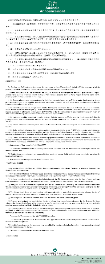 新型冠狀病毒感染應變協調中心公佈,衛生局根據第2/2004號法律《傳染病防治法》第10條及第14條的規定,調整第352/A/SS/2022號公告中由外國、香港特別行政區、台灣地區入境人士健康管理措施,自2022年10月15日起,取消在解除醫學觀察翌日起計第4至7天健康監測及在解除醫學觀察翌日起計第5、7天接受新型冠狀病毒核酸檢測的措施,但入境人士須在解除醫學觀察當天起連續4天進行自我健康管理及每天到社區核酸站接受核酸檢測。