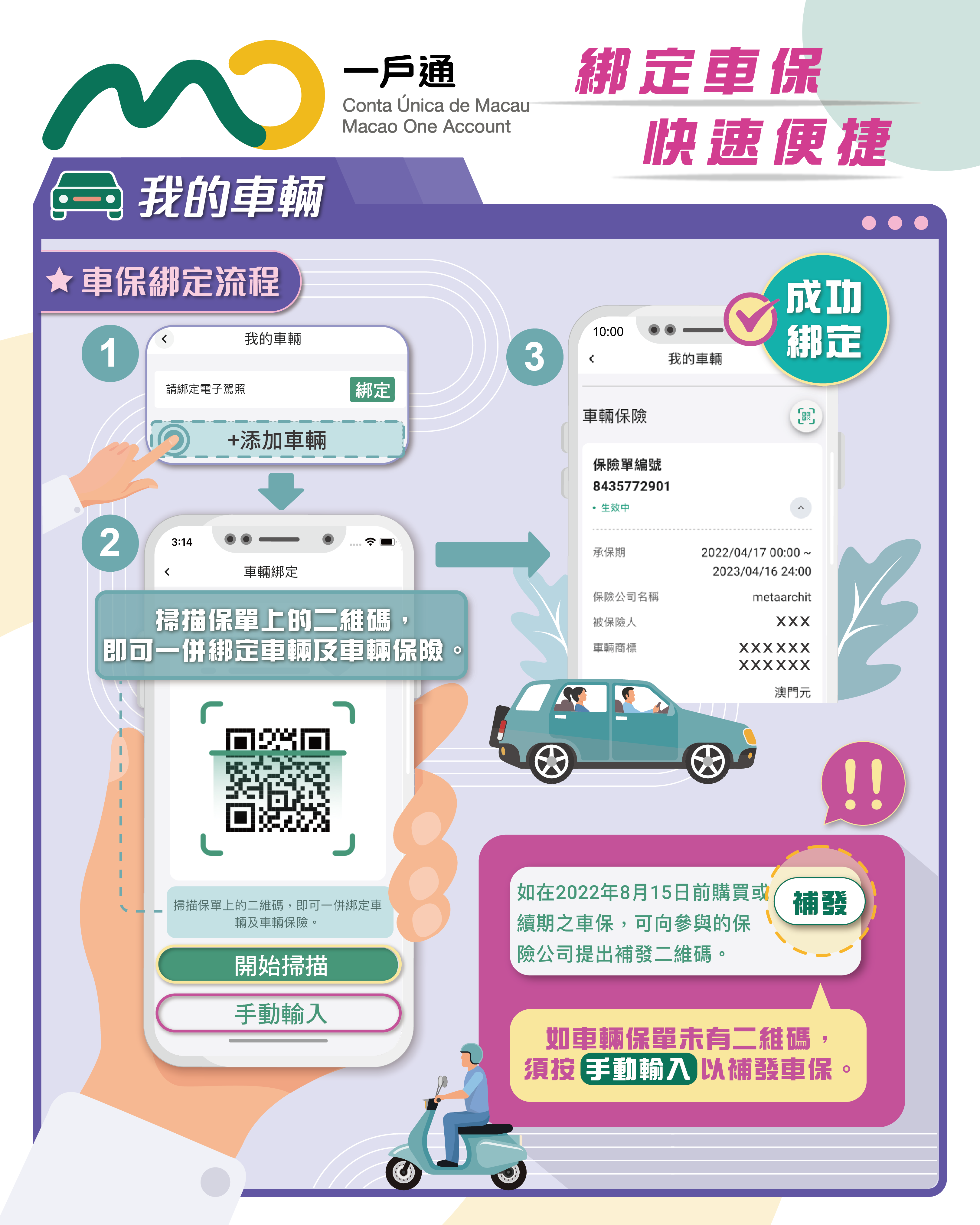 為便利使用相關的車輛電子化服務,特區政府呼籲駕駛者可選擇先行綁定自己持有的車輛。市民如欲了解“我的車輛”資訊,可瀏覽“一戶通”專題網站(https://www.gov.mo/zh-hant/app/),查看宣傳圖文包及教學短片。