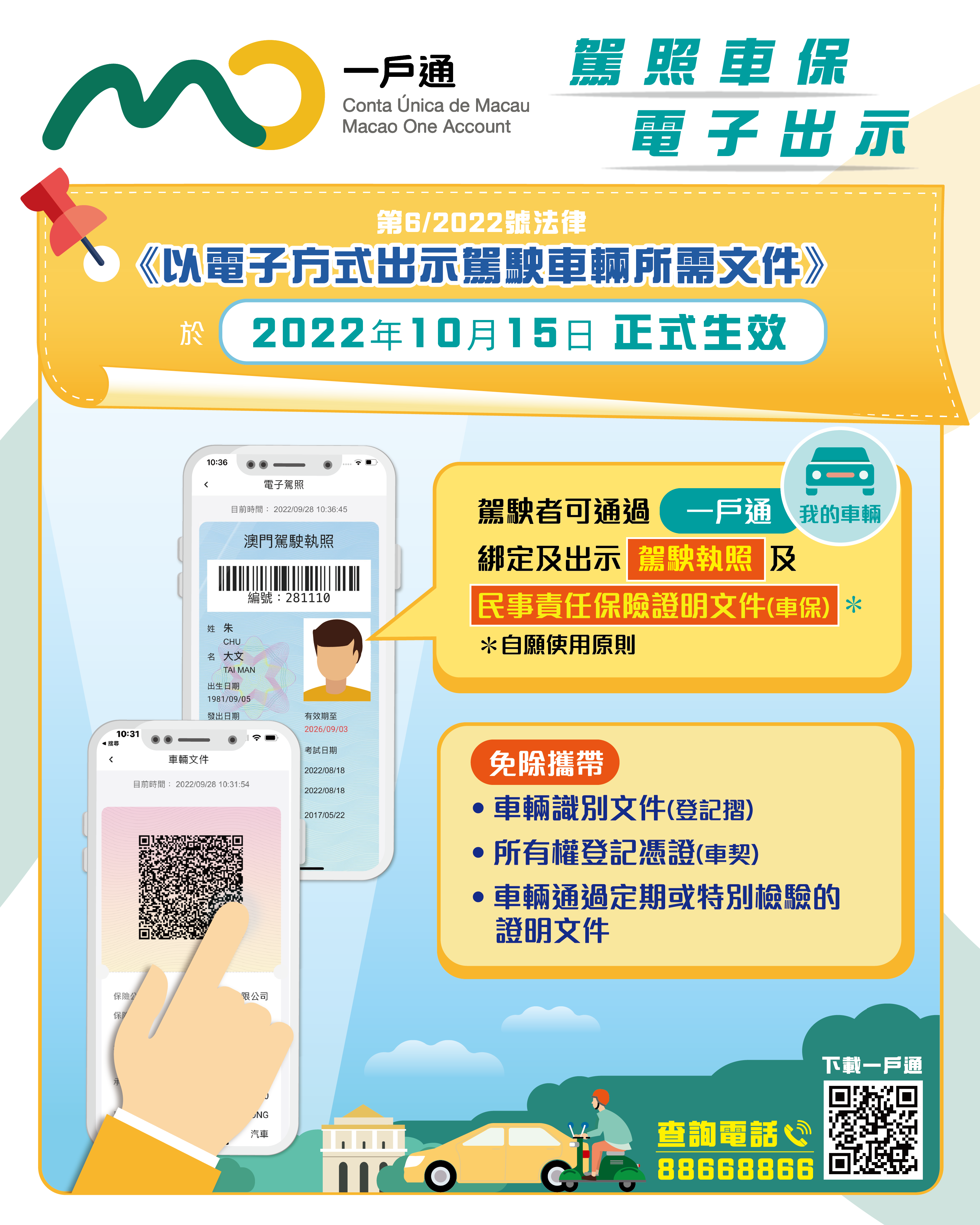 第6/2022號法律《以電子方式出示駕駛車輛所需文件》將於2022年10月15日生效。屆時,駕駛者在行車時可選擇透過“一戶通”,以電子方式出示駕駛執照和民事責任保險證明文件(車保),效力等同實體駕照及紙本車保。同時,駕駛者將可免除攜帶車輛識別文件(登記摺)、所有權登記憑證(車契)、車輛通過定期或特別檢驗的證明文件。為配合上述法律的生效,由即日起,駕駛者可透過“一戶通”綁定有效的澳門駕駛執照和特別駕駛許可證。