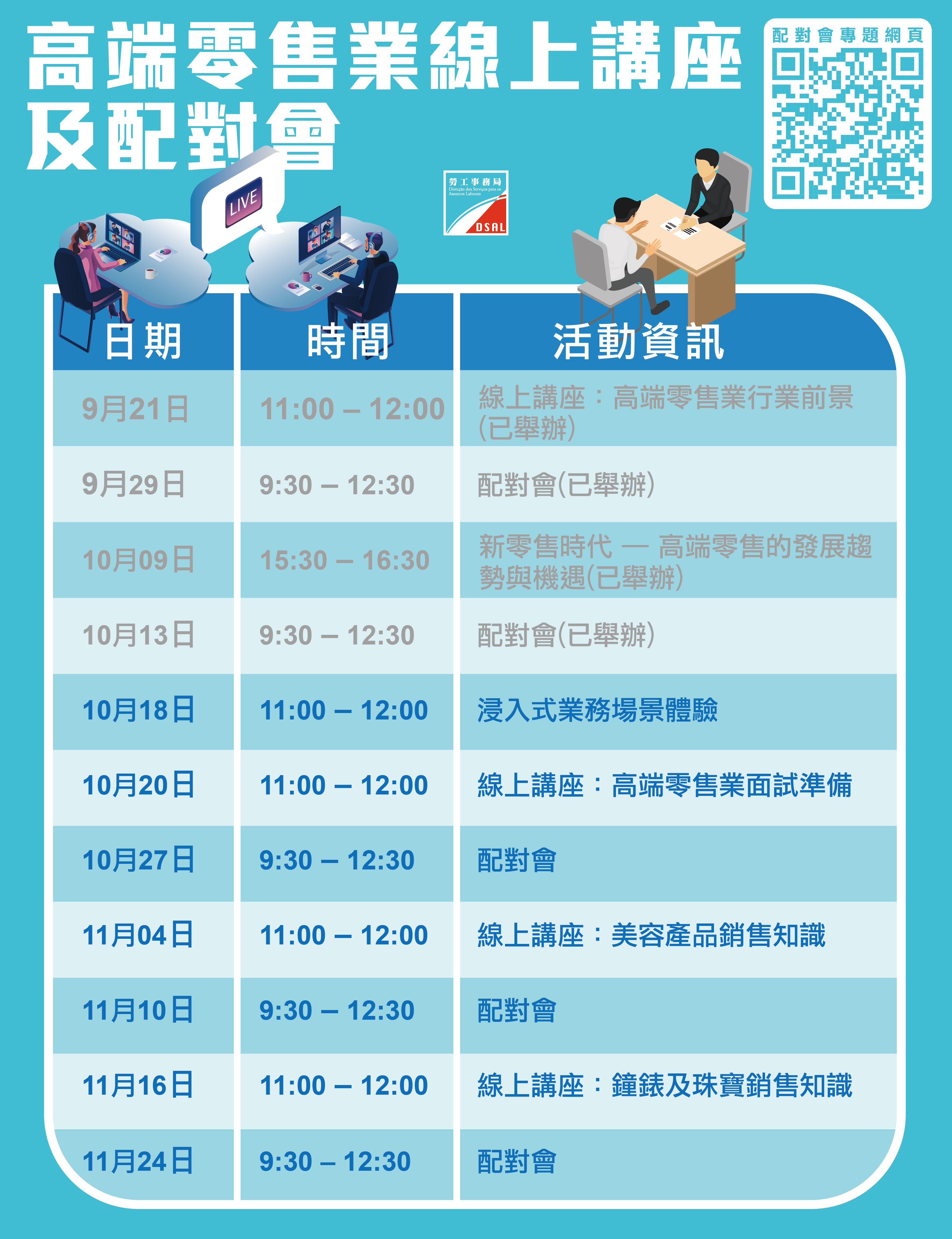 為協助求職者投身具發展前景的行業,勞工局在舉辦行業配對會同時,邀請業界舉辦講座介紹行業發展前景,增加求職者和招聘企業加強互動交流,增加成功配對機會。勞工局9月至11月期間與企業合辦多場高端零售行業的講座和配對會,歡迎有意人士報名參加。