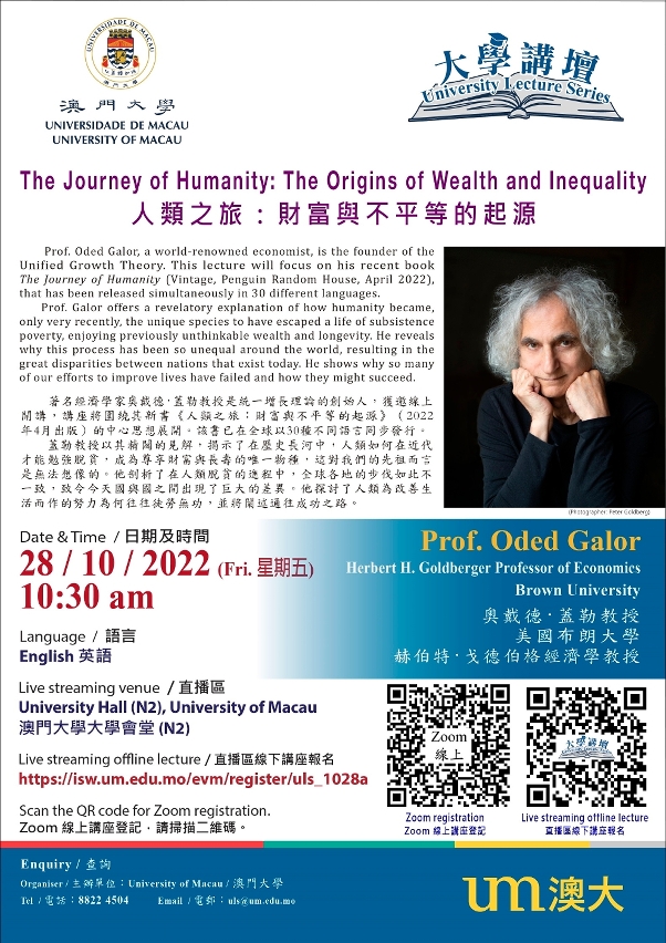 澳門大學將於10月28日(星期五)舉辦“大學講壇”講座,由著名經濟學家奧戴德·蓋勒(Oded Galor)擔任講者,以“人類之旅:財富與不平等的起源”為題發表演說,探討人類文明數項重大課題,如發展、貧窮、增長、財富、不平等之間的關係。講座將線上線下同步舉行,歡迎有興趣人士參加。