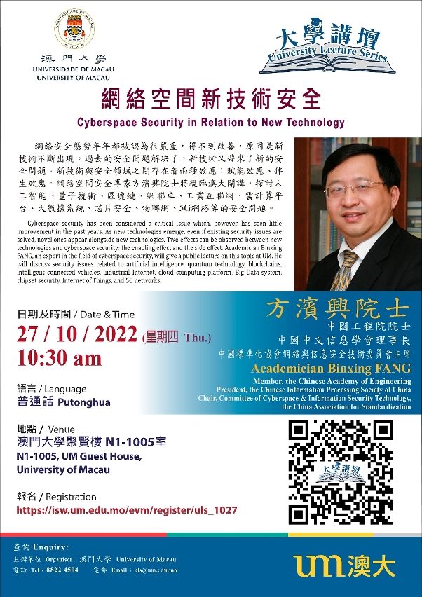 講座上,方濱興將從不同維度探討人工智能、量子技術、區塊鏈、網聯車、工業互聯網、雲計算平台、大數據系統、芯片安全、物聯網、5G網絡等的安全問題。講座將於10月27日(星期四)上午10時30分於澳大聚賢樓N1-1005室以普通話進行。查詢請致電8822 4504與鍾小姐聯繫。