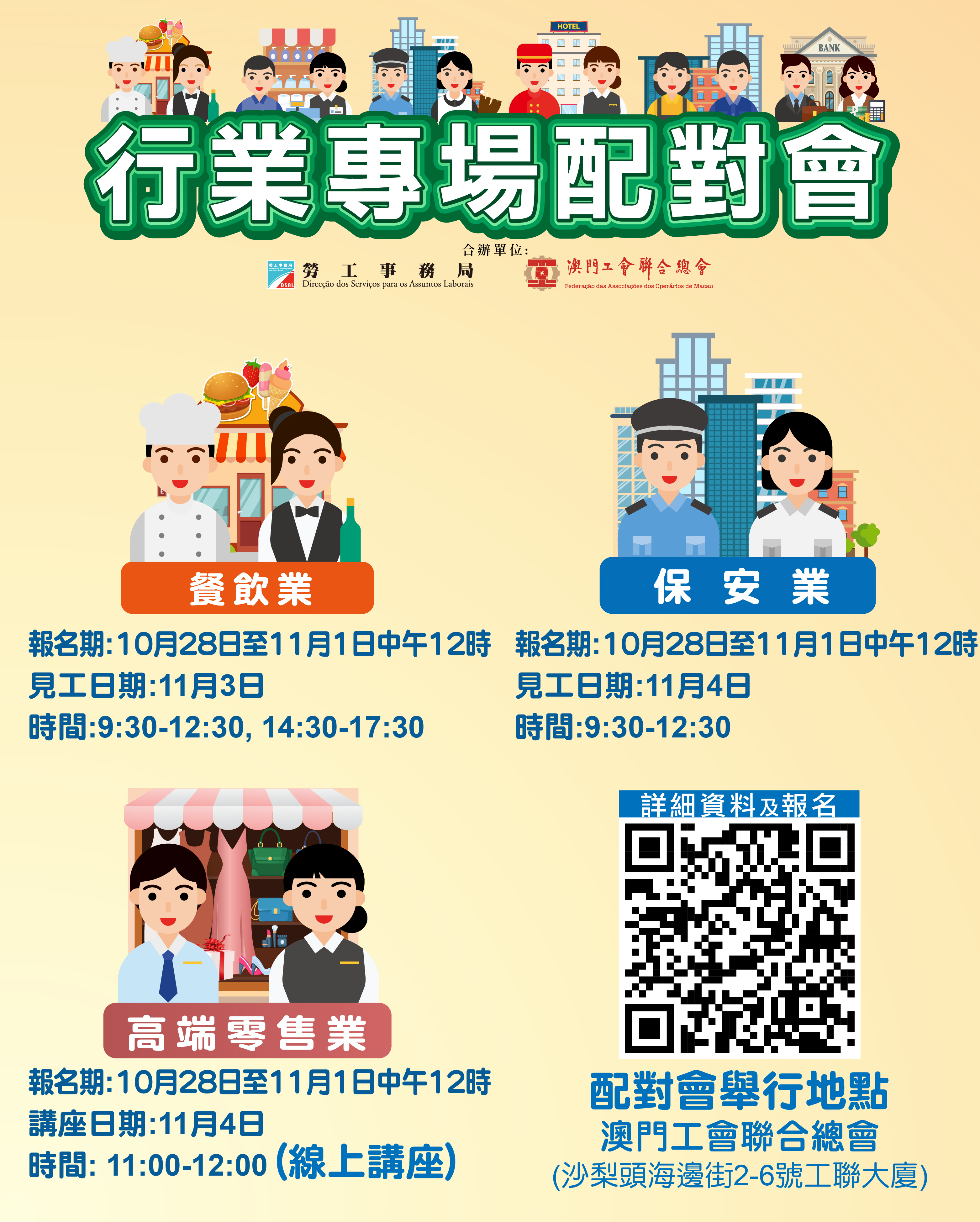 勞工事務局持續與澳門工會聯合總會合辦專場配對會,11月3日及4日舉辦3場餐飲及保安業專場配對會,合共提供144個空缺,有興趣人士可於10月28日起網上報名參加。