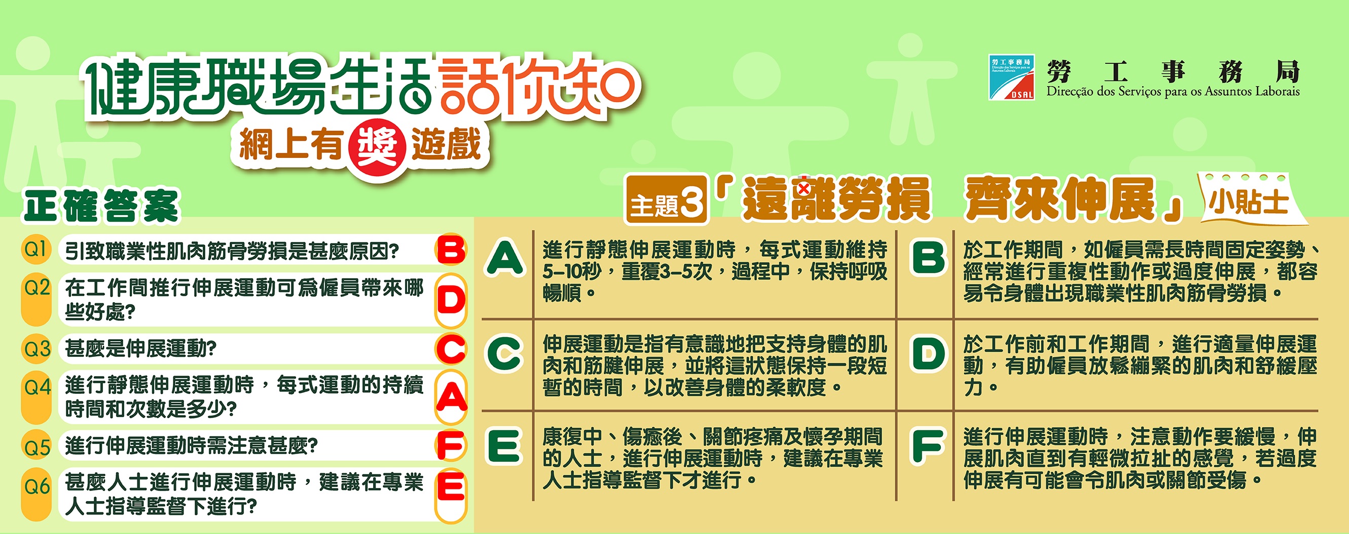 為持續提升巿民的職業安全健康意識,加強對工作安全和健康的關注,勞工事務局舉辦「健康職場生活話你知」有獎遊戲,主題為『遠離勞損 齊來伸展』小貼士,有關活動已於10月16日結束。