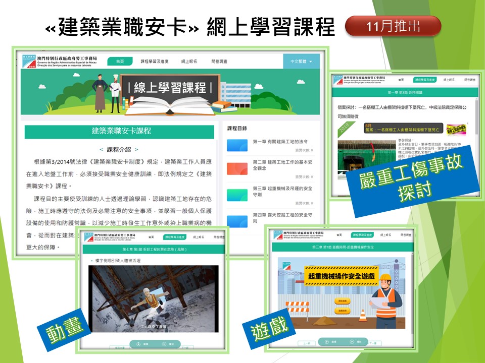 勞工局積極向各行業推動職安健文化,提高各行業人士的職安健意識和水平,先後推出《酒店及飲食業職安卡》和《建築業職安卡》網上學習課程。市民除可透過勞工局網上學習平台進行學習,亦可於勞工局“職安健天地”專題網頁 https://www.dsal.gov.mo/dsso/zh_tw/standard/index.html 下載《建築業職安卡》教材及瀏覽教學視頻。“職安健天地”專題網頁載有各行業職安健資訊,歡迎公眾瀏覽。