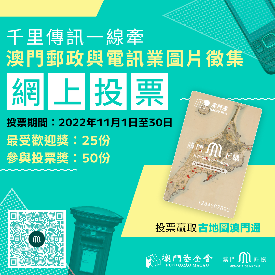 澳門基金會開展的“澳門記憶”文史網早前於網上舉辦“千里傳訊一線牽──澳門郵政與電訊業圖片徵集”,截至徵集期結束,活動專頁收穫近1,200張圖片,經評審委員會評選,共157張圖片入選。為與市民分享徵集成果,攜手傳承澳門郵政和電訊業發展的記憶,即日起於“澳門記憶”文史網 ( www.MacauMemory.mo ) 舉辦網上投票活動,並設獎項鼓勵市民大眾參與。