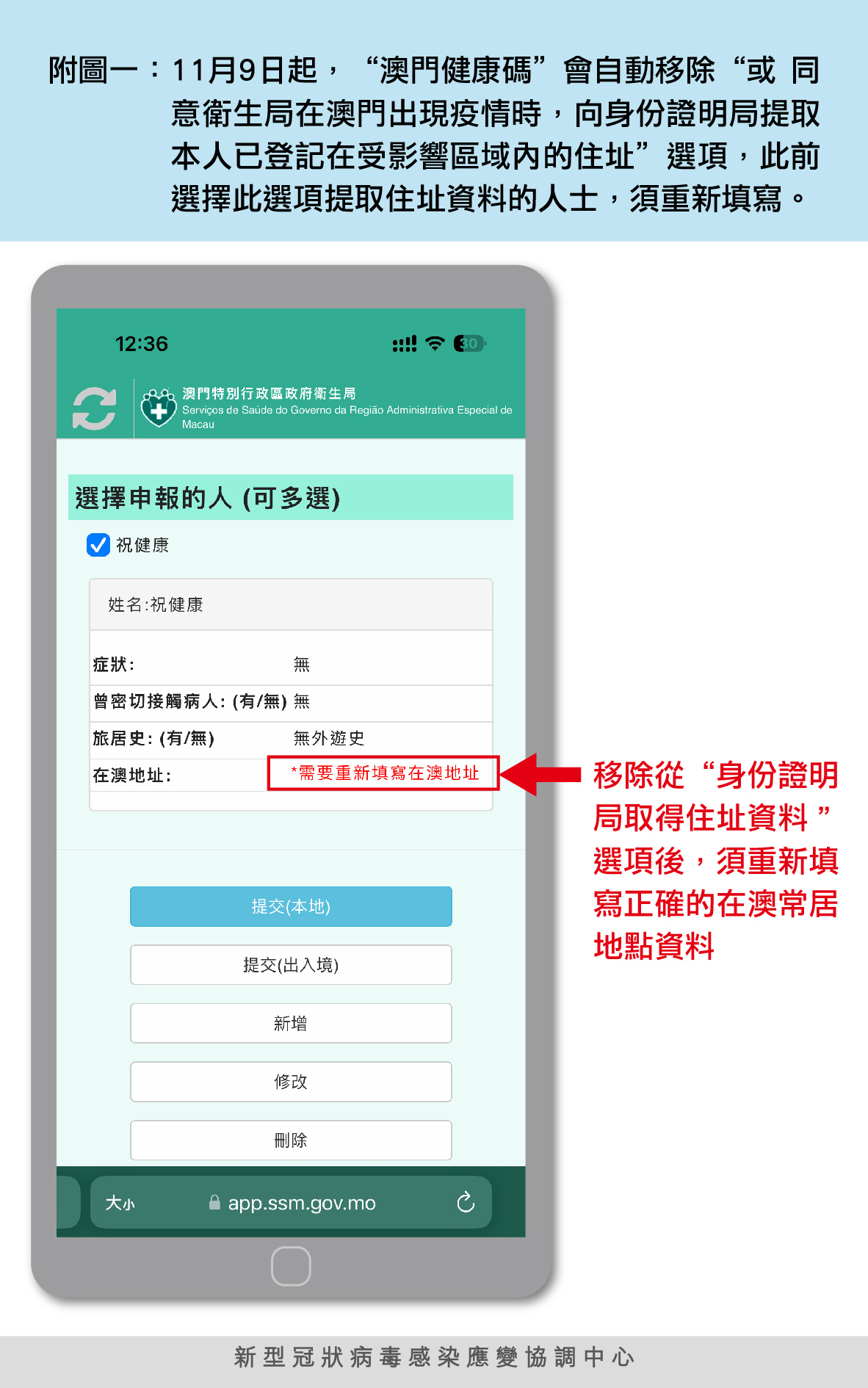 新型冠狀病毒感染應變協調中心(下稱應變協調中心)表示,有部分居民在“澳門健康碼”填寫在澳常居地點時,選取了“或 同意衛生局在澳門出現疫情時,向身份證明局提取本人已登記在受影響區域內的住址”選項,但因事先沒有更新身份證明局的最新住址資料,結果出現在防疫管控期間因住址資料錯誤而被轉為紅碼或黃碼的情況;為避免居民因上述情況引起的不便,11月9日(下週三)起“澳門健康碼”將自動移除“或 同意衛生局在澳門出現疫情時,向身份證明局提取本人已登記在受影響區域內的住址”選項,屆時居民須自行更新及填報正確的在澳常居地點資料,才可生成健康碼。